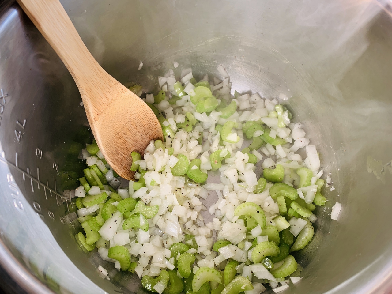 - Saute and add 2 teaspoons oil to pot. Add onions and celery and cook for 3 minutes. Add garlic and stir to combine. Add mushrooms, rice, broth, 2 teaspoons salt, 1/2 teaspoon black pepper, bay leaf and chili flakes. Stir to combine soup mixture. Cancel Saute.