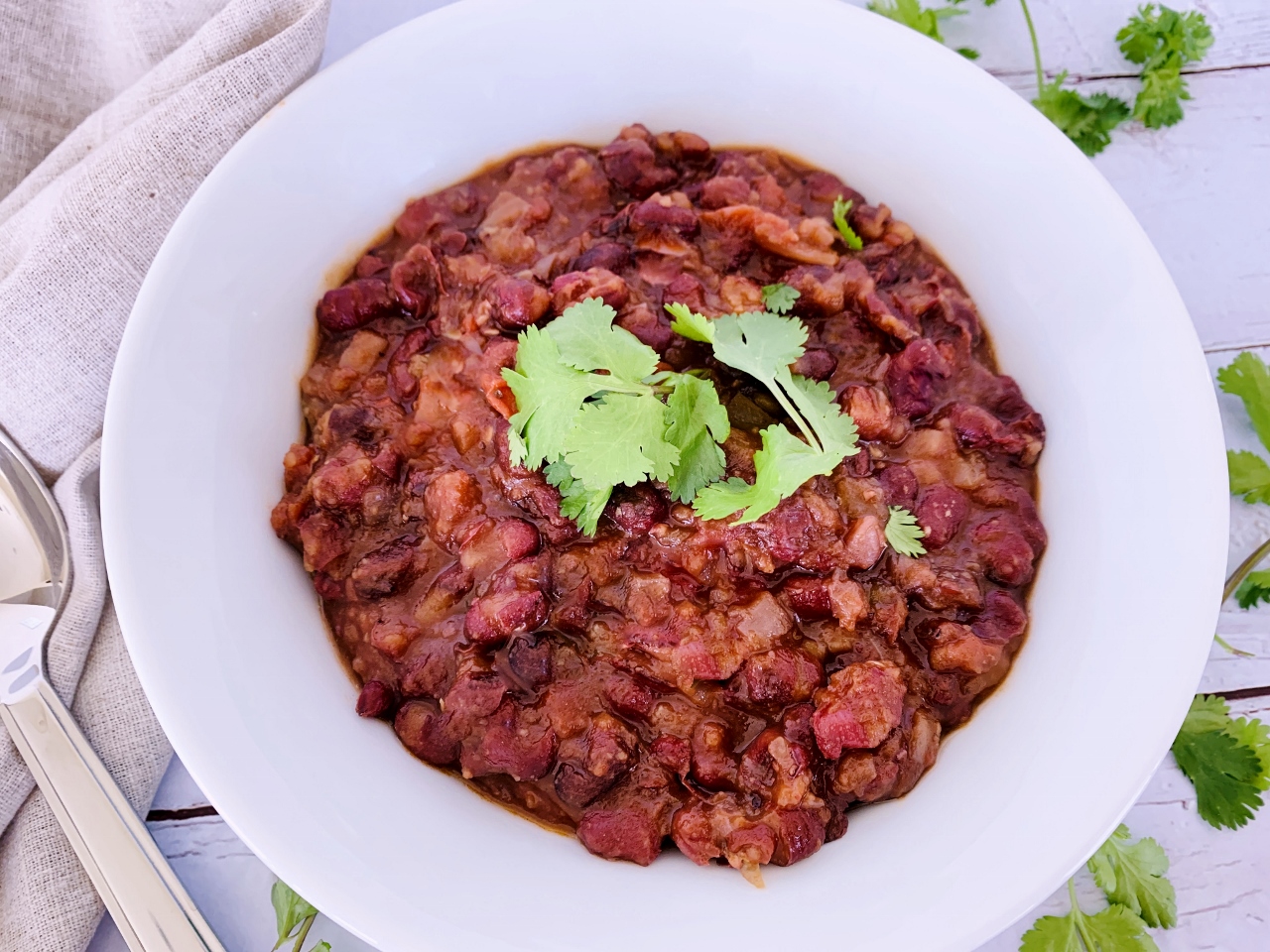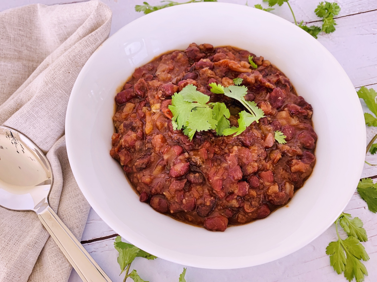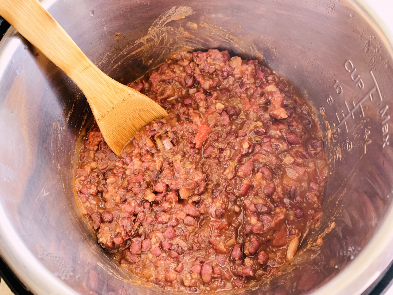 I use canned tomatoes and tomato paste to create the base of the sauce in this recipe. The spice comes from some pickled jalapenos, which are easy enough to find. The entire pot of beans is done in less than an hour, and you can keep them warm all day until mealtime, in the Instant Pot. I think these beans are great served in a bowl, like chili, but you could spoon them into tortillas, or alongside other protein, and have a fabulous meal as well.