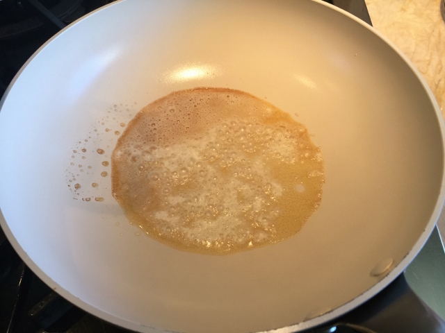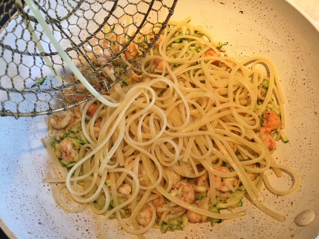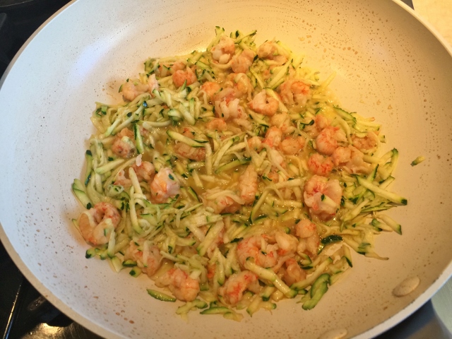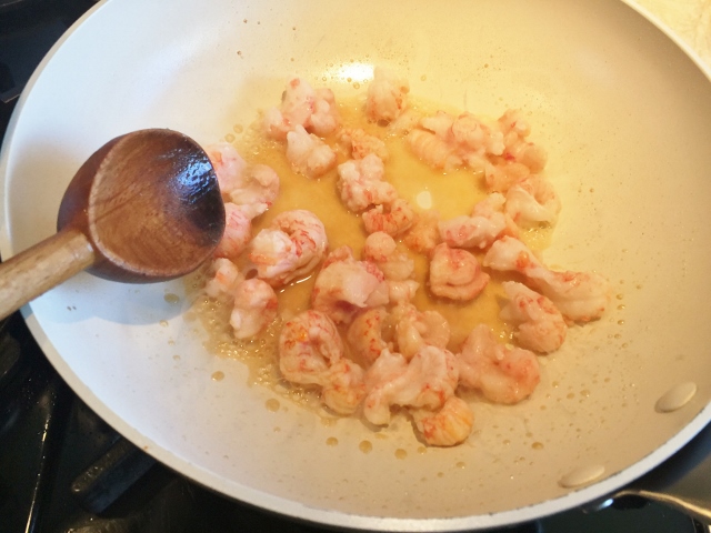 2. Boil pasta for 10 minutes. While pasta is cooking, shred zucchini and mince garlic. In a large saute pan over medium high heat, add butter. Cook the butter until lightly golden brown, about 2 minutes. Add frozen langoustine and cook for 4 minutes, stirring occasionally.