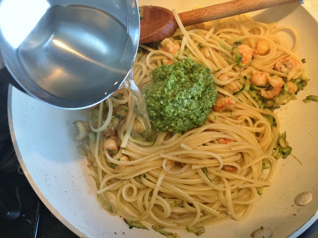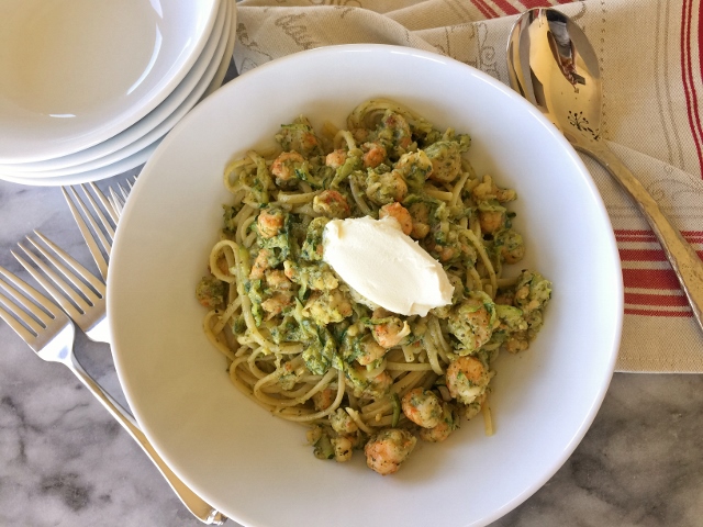 The combination of flavors in this Langoustine Arugula Pesto Pasta are delightful with a fresh hint of the sea. I added shredded zucchini to the dish as well, to bump up the vegetables – shhh don’t tell – no one will even notice. I think this is a real family pleaser and can be eaten hot or room temperature. Also, great to eat chilled as a salad for lunch the next day.