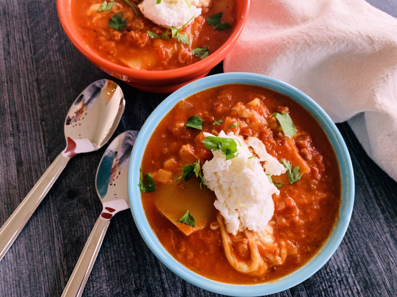 This recipe may vary in its presentation, but not in taste. The meat sauce is almost traditional, but with chicken broth added, to thin it appropriately enough to call soup. The noodles are added directly into the liquid to form a bubbling cauldron of meaty marinara, but once the cheese enters, game over – things get pretty gooey, and release the creamiest of consistencies. The quietly simmering soup is ladled into bowls and topped with a fluffy spoonful of ricotta cheese, for a finishing touch.