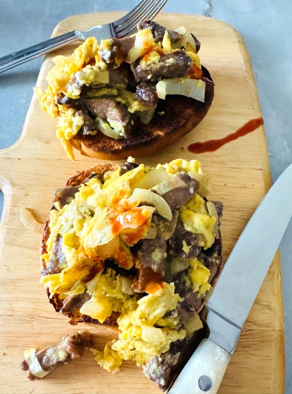 - Toast bun and spread with remaining butter. Top with steak and egg mixture.