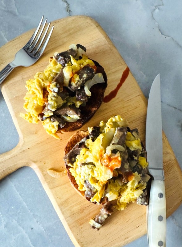 Tender slices of steak pair perfectly with a freshly cooked egg and your favorite bread or bun. It’s a filling and flavorful way to jumpstart your day without letting that perfectly cooked steak go to waste.