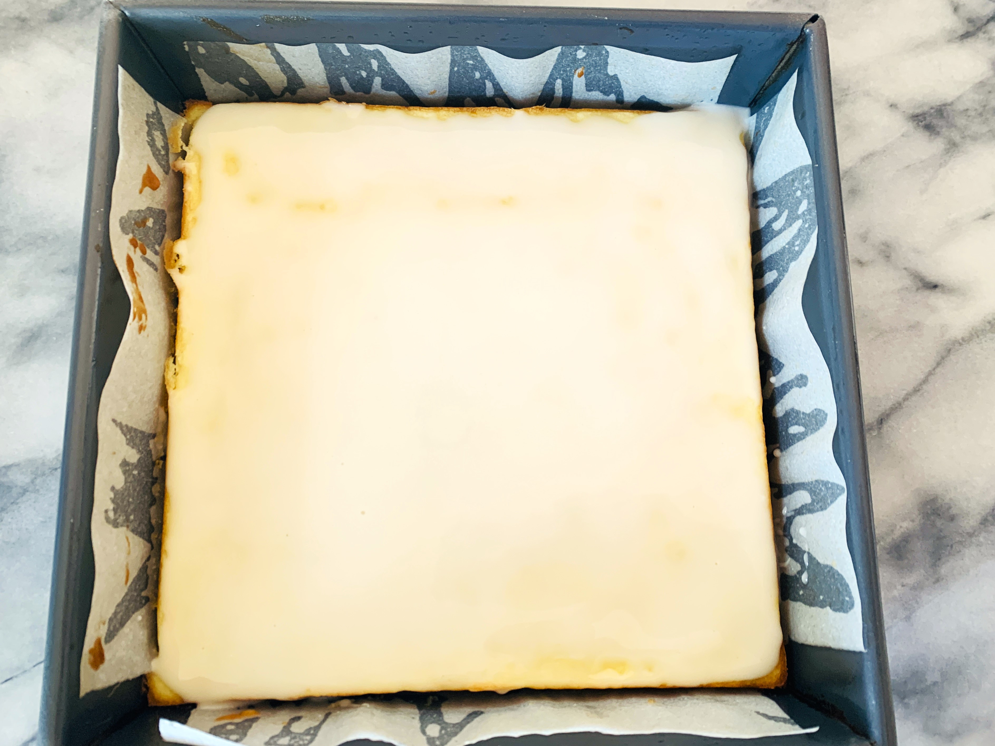 5. Remove and cool.  Whisk glaze and pour over top.  Cut into squares.  Enjoy!