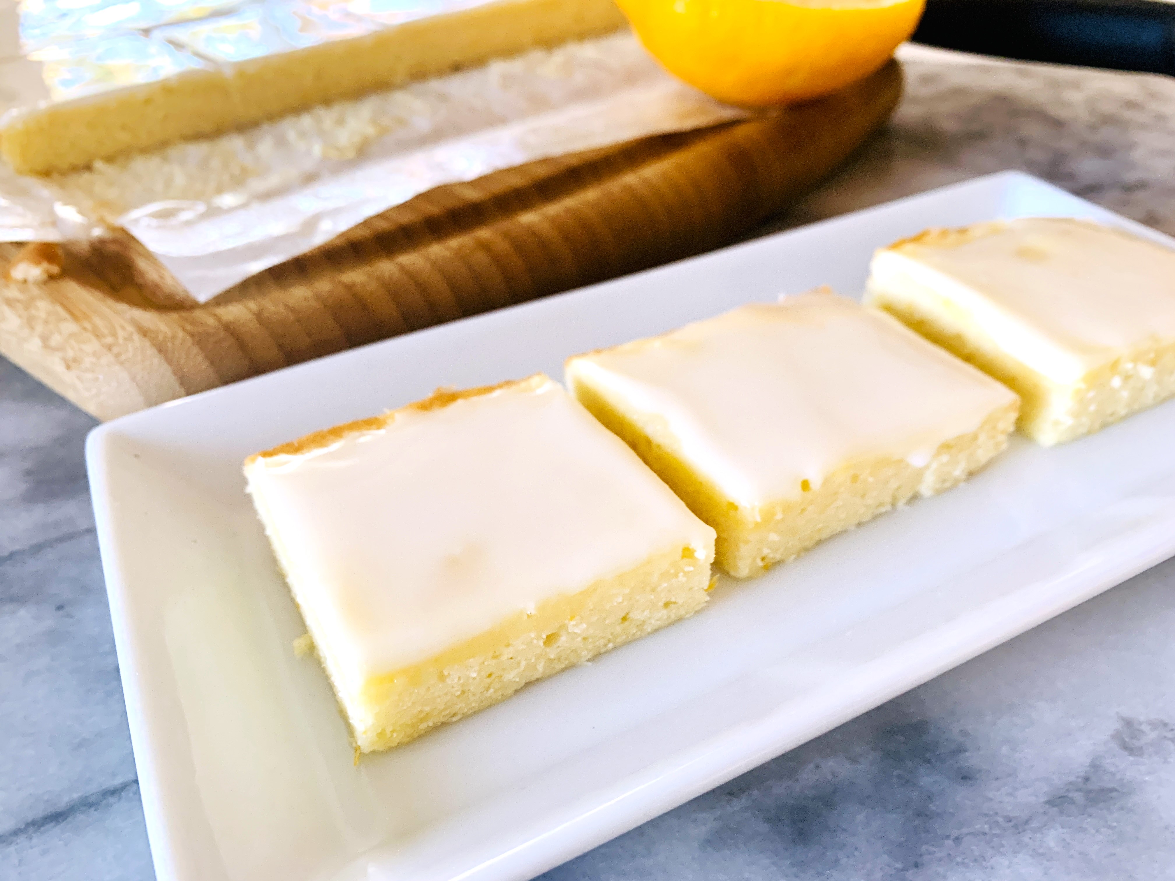 My brother-in-law is in town to celebrate his 60th birthday and he just loves lemon, so I made him these lemon blondies as a pre-birthday dessert when he arrived.  Luscious lemon blondies are a cross between a bar and a cake, but there is no crust or lemon custard poured over top, just a buttery batter with both lemon zest and lemon juice added for some citrus taste.  The whole dessert is made with just a few ingredients and baked in one pan.  A quick glaze is spread over top to create an even sweeter lemon infusion that is super delicious.