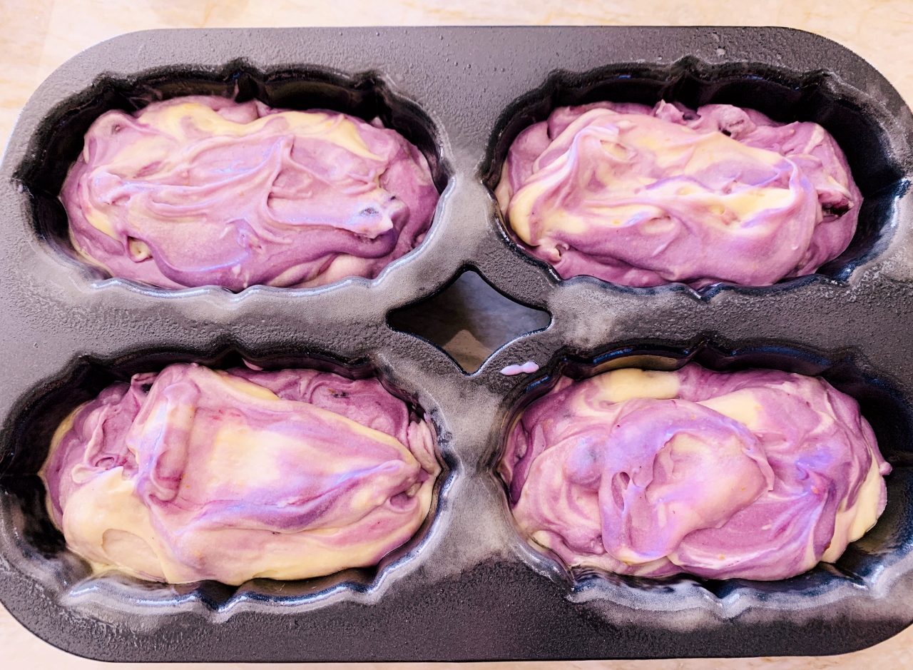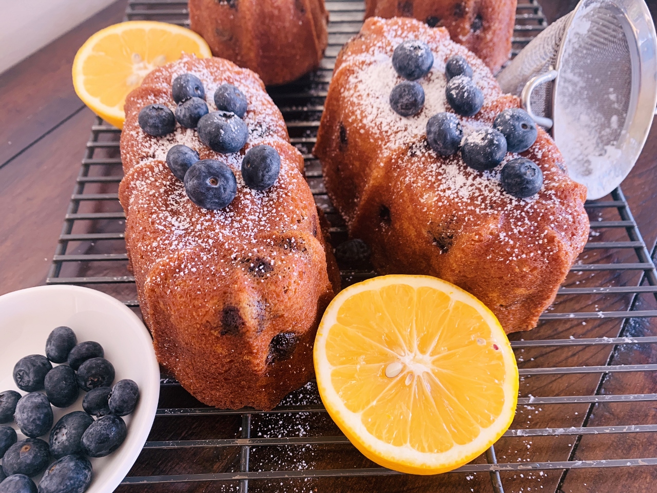 - Add blueberries to batter and stir by hand until just combined, and slightly swirled. Spoon batter into prepared pans and bake for 30-45 minutes depending upon size of pan. Remove from oven and let cool for 30 minutes.
