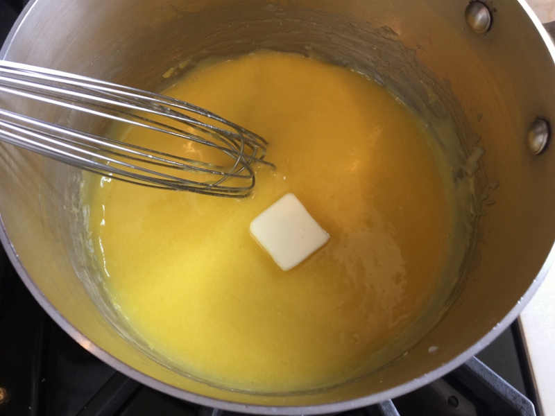 2. While crust is baking, make Lemon Curd – In a saucepan, add sugar, lemon juice, cornstarch and salt. Heat on medium-low until simmering. Place eggs and yolks in a bowl, and whisk until frothy. Add 1/4 cup of warmed sugar to eggs, while continuing to whisk. Pour warmed egg mixture into sugar mixture and continue to whisk until thickened, about 2 minutes. Remove from heat and add butter, whisk until smooth.