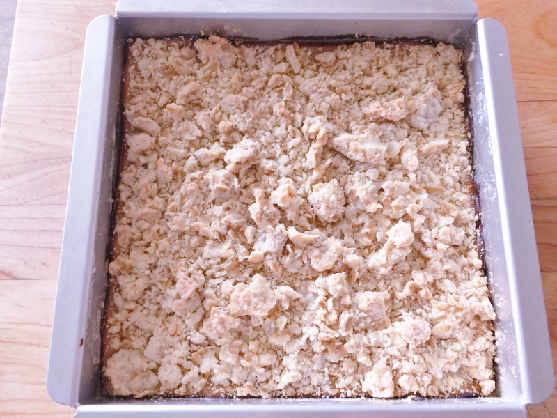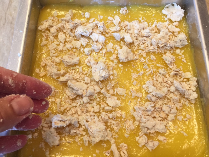3. Spread curd over baked crust until smooth. In a food processor add all Crumb Topping ingredients and pulse 5 times. Using your fingers, press the mixture together to form larger crumbs. Toss crumbs on top of curd, until covered.