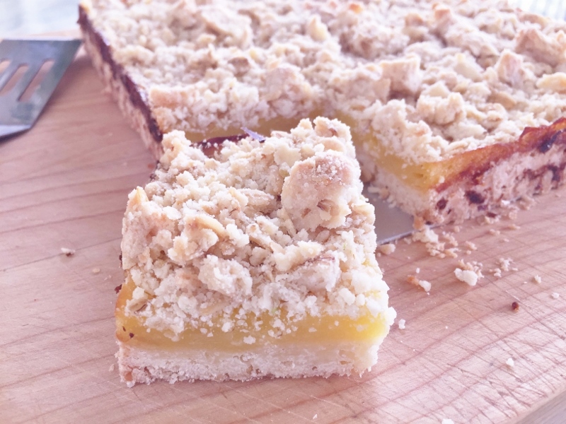 The crust on the bottom is similar to shortbread with an airy feel, and the lemon curd is made on the stove top and poured over the crust. Many lemon bar recipes create a liquidy citrus mixture and pour it over the top without creating a curd first, and for me, it just doesn’t have enough pop of lemony flavor. I think a true lemon curd adds to the decadent texture of these bars, and gives them the right citrusy bite. As for the crumb topping, it’s a quick combination of flour, powdered sugar and oats with a little more butter to create a superb crunchy balance after baking.