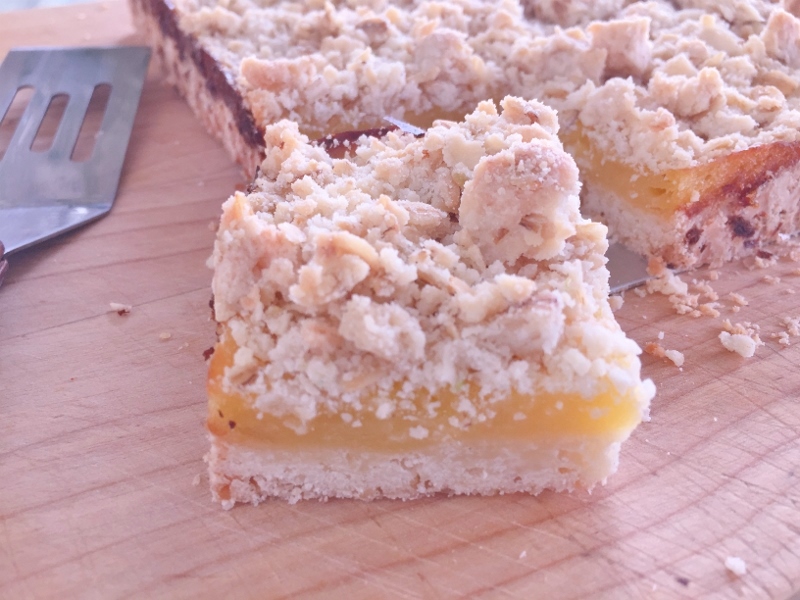 3. Spread curd over baked crust until smooth. In a food processor add all Crumb Topping ingredients and pulse 5 times. Using your fingers, press the mixture together to form larger crumbs. Toss crumbs on top of curd, until covered.