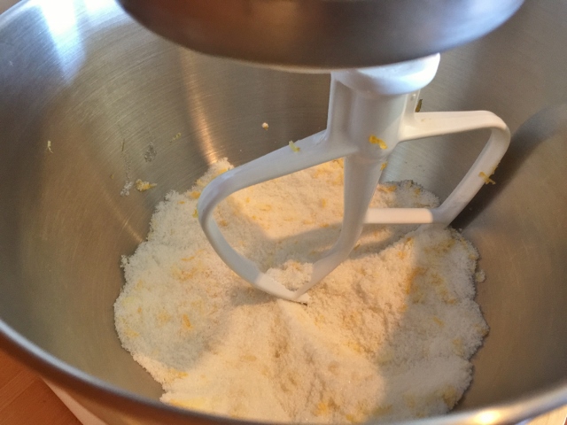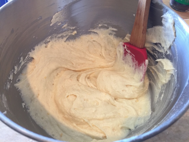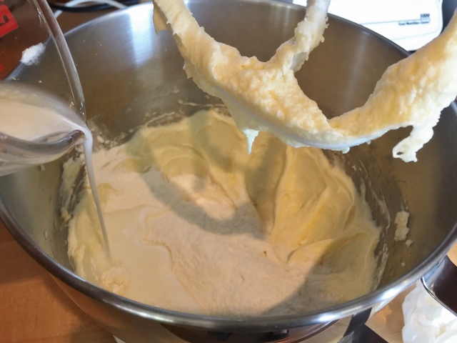 2. Add the sugar and mix for 2 minutes on high speed, then add the eggs to the sugar mixture, and mix on high speed for 2 minutes. In a measuring cup, mix together the buttermilk and lemon juice. Add 1/3 of the flour mixture to the sugar mixture, and 1/3 of the buttermilk mixture – mix on low speed for 30 seconds. Repeat twice and mix on low until combined.