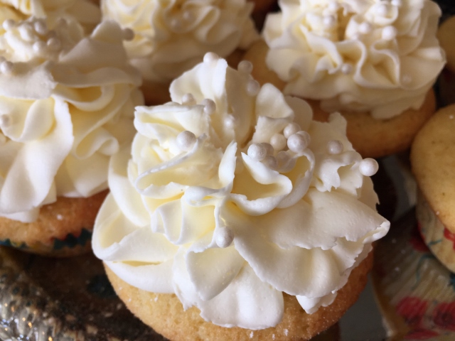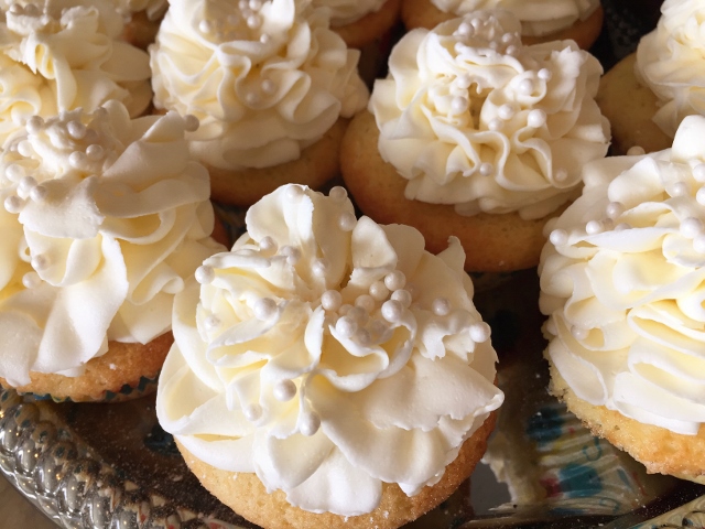5. Frost the cupcakes with a pastry bag and tips or with a knife for a rustic look. Decorate with pearl candies or other white sprinkles. Enjoy!