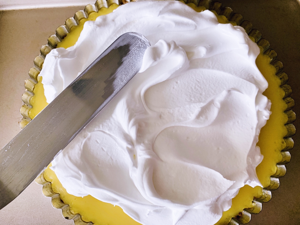 - Pour egg white mixture into stand mixer and whip on high speed for 2 minutes. Add cream of tarter and continue to whip until firm peaks, but not dry. Spoon on top of tart, exposing an inch of lemon filling around edges. Toast with torch or under broiler, if desired. Chill until ready to serve. Enjoy!