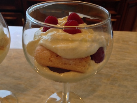 7.  Dip the ladyfingers into the brandy for 3 seconds in batches. Place the ladyfingers in the glasses to start the layering of the trifle. You may need to break the cookies to fit.  Continue with a dollop of lemon curd on top, followed by 3 raspberries and then more ladyfingers.  Finish with a dollop of whipped cream and more fresh raspberries, enjoy!