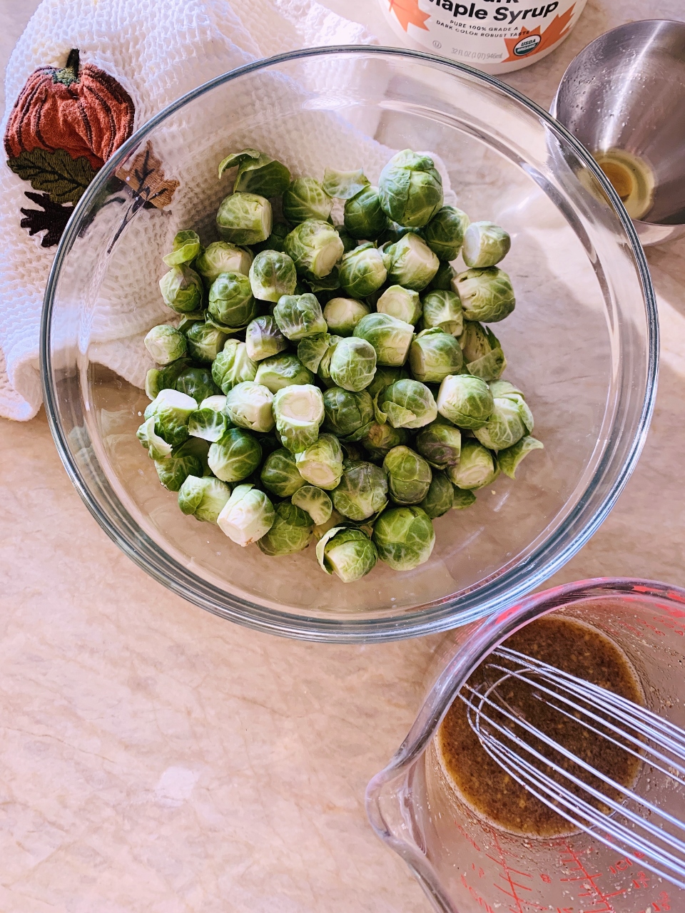 3. Add brussels sprouts to pan and cook over medium-high heat for about 5 minutes, stirring occasionally.  Whisk maple syrup, mustard, black pepper, and salt together in a measuring cup or small bowl.
