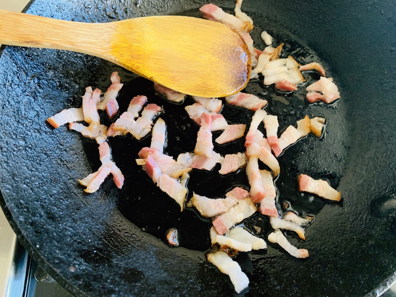 2. Add sliced bacon to an iron skillet and place over medium heat.  Cook bacon until crispy, and remove it with a slotted spoon, set aside.  Leave remaining bacon fat in pan.