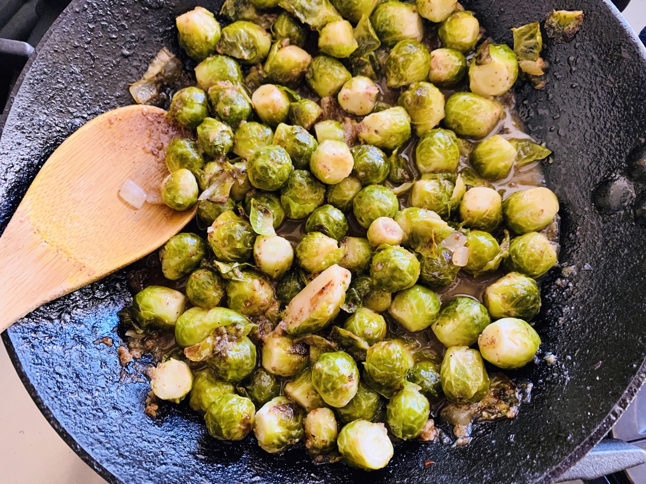 4. Pour sauce over sprouts and turn heat to low.  Cover pan with lid and continue cooking for 7-10 minutes, or until sprouts are fork tender.