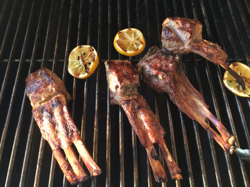 3. Using a paper towel, wipe herbs off of lamb chops – they will burn. Place lamb chops and sliced lemons on grill and cook for 8 minutes on first side, flip over – remove lemons. Cook another 8-10 minutes, or until desired doneness. Remove chops from grill and let rest.