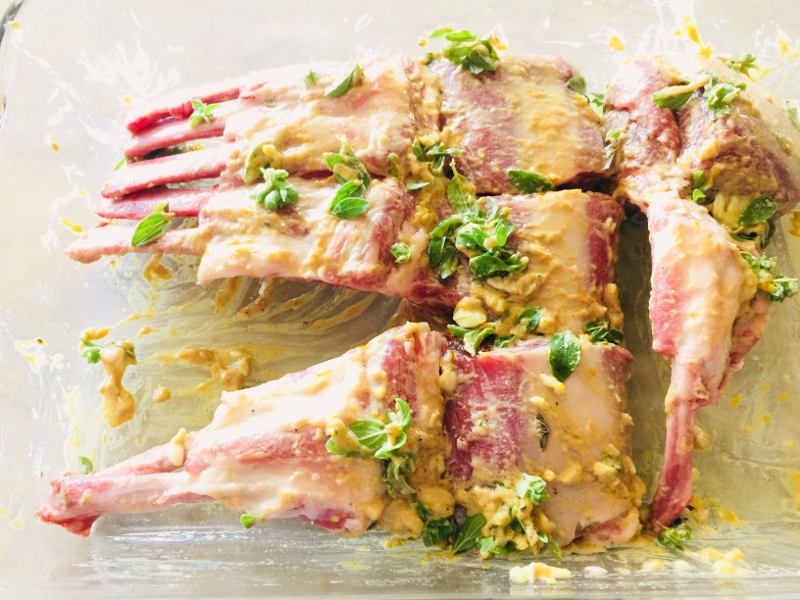 1. Slice lamb chops into four sections, about 2 ribs per section (you can have the butcher do this for you, if needed). In a glass dish, add all marinade ingredients, stir. Add chops and coat on all sides, cover and refrigerate for at least 4 hours, up to overnight.
