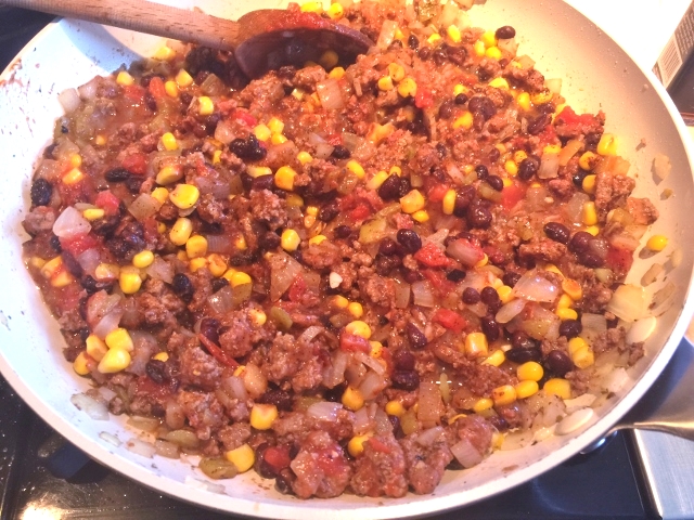 2.  Add salt, pepper, cumin, chili powder, oregano and cayenne, stir.  Cook for 2 minutes to incorporate flavors.  Add corn and chilies and stir to combine, continue cooking for 3 minutes.  Add tomato puree and black beans, stir to combine and turn heat to low.  Simmer mixture uncovered for 10 minutes.  Pour into a greased casserole dish.