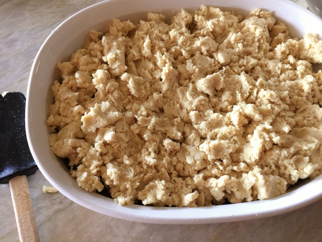 4.  Dollop dough over filling – it will look like a soft crumble.  Bake in oven for 25 minutes, then sprinkle cheese over top and bake again for 5 minutes.  Remove from oven and serve on plates.  Enjoy!