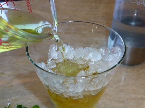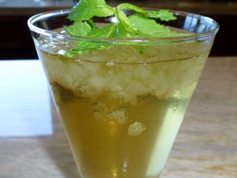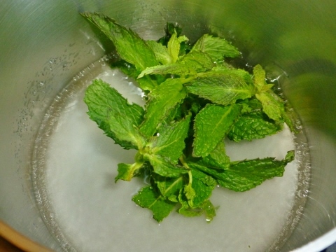 1. In a small pot over medium heat, add sugar, water and 2 mint sprigs. Boil sugar until it is dissolved and then remove from heat. Pour sugar syrup into a glass measuring cup – you can do this step several days ahead. Cool to room temperature or store in refrigerator until ready to use.
