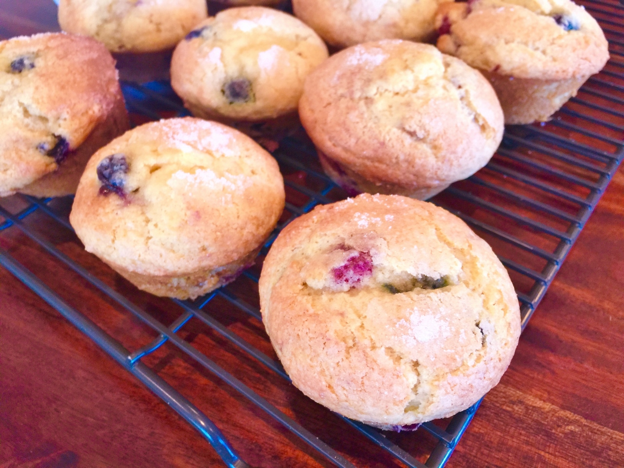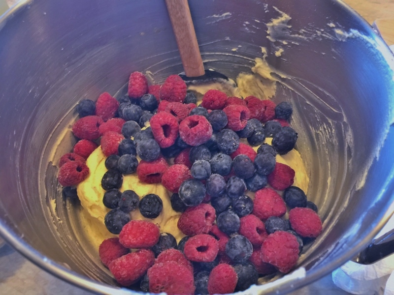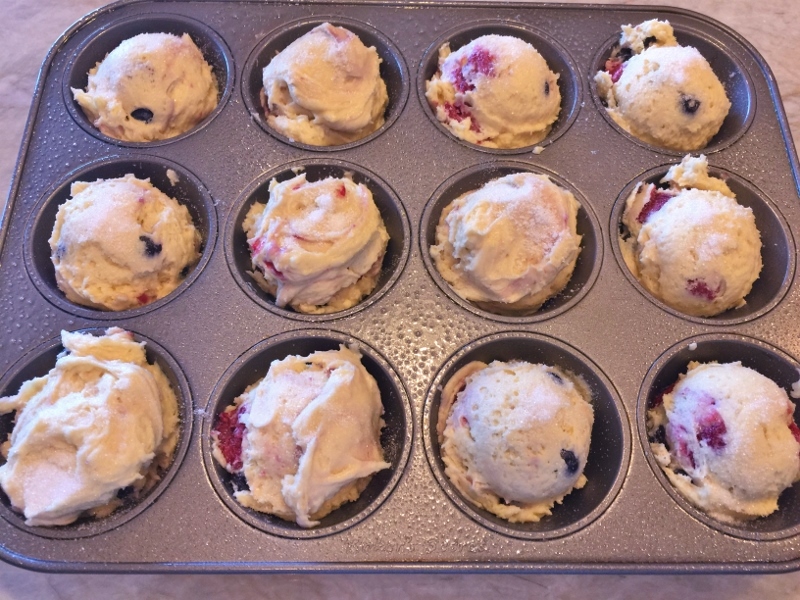 2. Pour in milk and mix on low for 30 seconds. Remove bowl and stir by hand, until all ingredients are incorporated. Add berries and stir again. Spoon into prepared pan, using ice cream scoop. Sprinkle tops with granulated sugar.