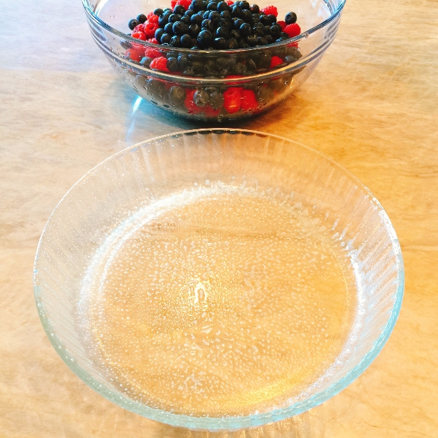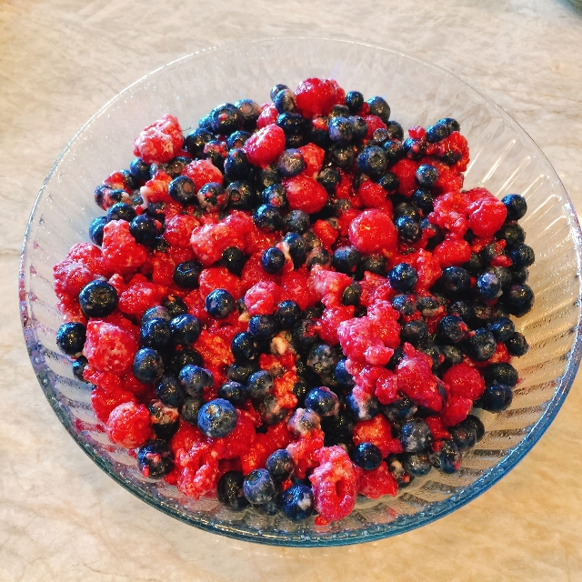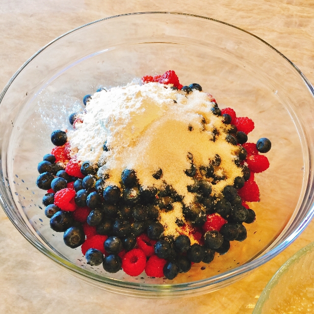 1. Preheat the oven to 350 degrees and grease or spray with oil a 1 quart oven proof dish. In a large bowl, combine the berries, flour, sugar and lemon juice. Using your hands, toss to combine.