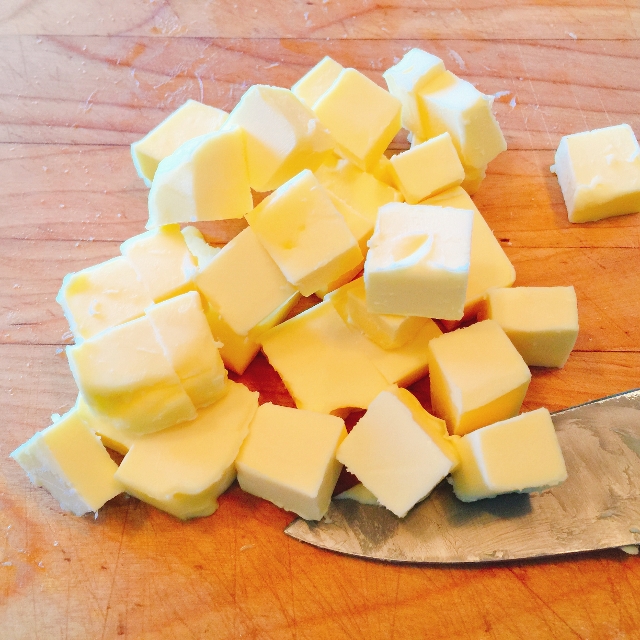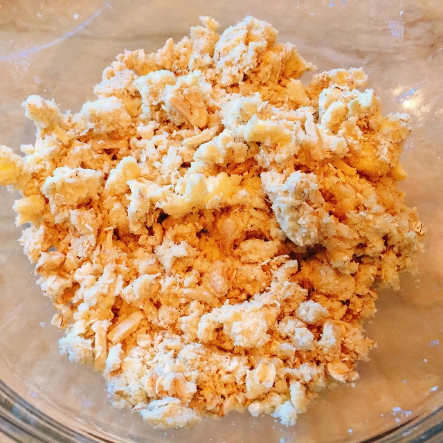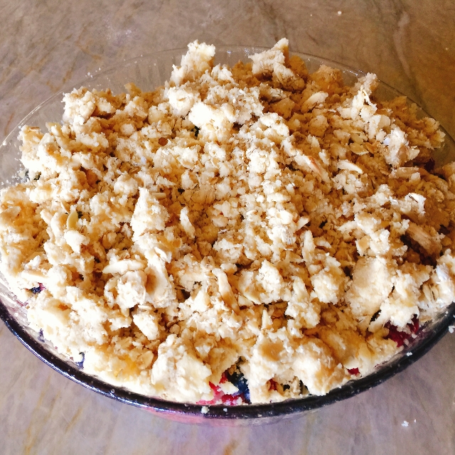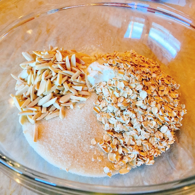 2. Pour the berries into the prepared dish. In another bowl, combine the flour, oats, almonds and sugar, stir to combine. Dice the butter into 1/2 inch pieces and add it to the flour mixture. Using your hands, press the butter into the flour mixture, until it resembles coarse crumbs.