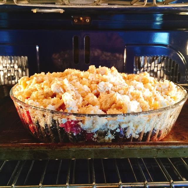3. Sprinkle the crumb topping over the berry mixture. Place the dish on a baking sheet and bake in the oven for 40-50 minutes, or until the edges are bubbling and the top is golden brown.