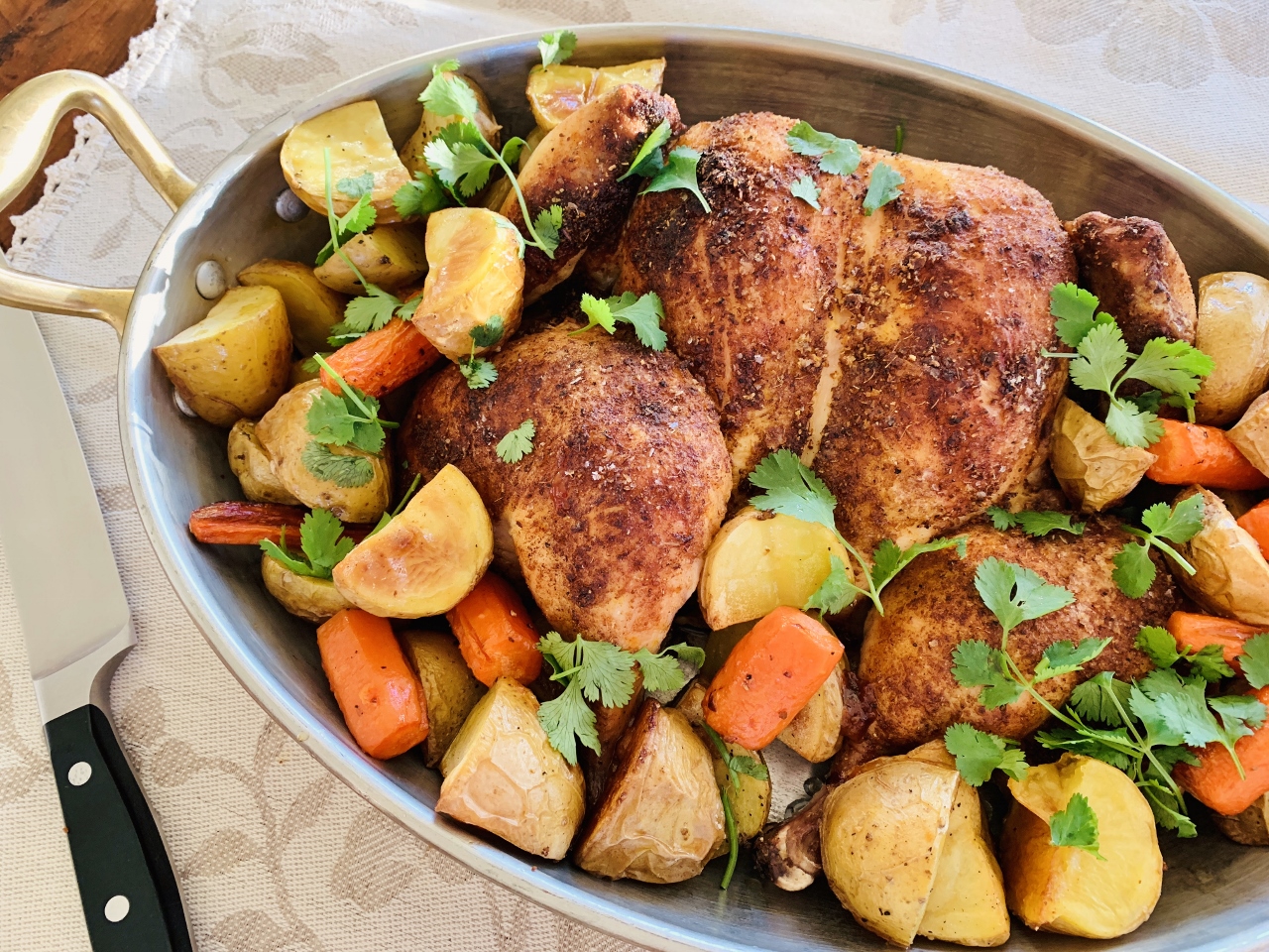 New Potatoes and carrots roast up beautifully in the same amount of time without a lot of fuss. The chicken and vegetables come out crispy on the outside and creamy tender on the inside, and don’t let those pan juices go to waste. Pour them over the sliced chicken and serve a little extra on the side. A crisp white wine or fruity Zinfandel pair nicely with this meal and don’t forget to invite some friends.