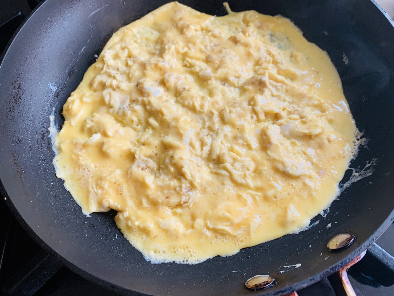 2. In a bowl, whisk eggs and cream.  Add remaining butter to skillet and place over medium-low heat.  After butter is melted, add eggs.  Using a rubber spatula, move eggs in a circular move until some soft curds form, about 2 minutes.  Make sure there are no holes in bottom of egg base.