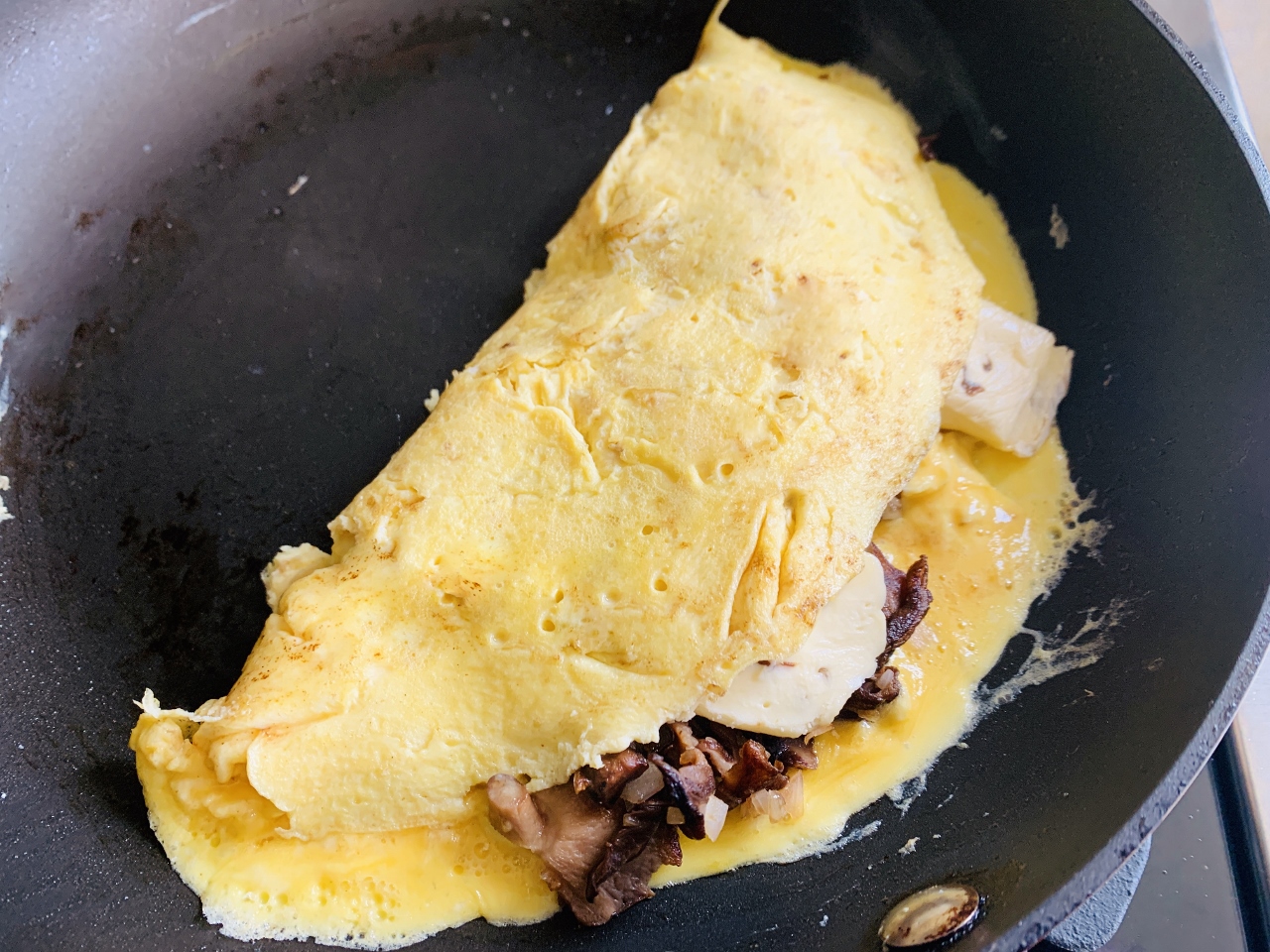 After adding the eggs, you gently move the spatula in a circular motion to create curds, while keeping the bottom of the skillet covered, no holes.  The texture should have loose curds and be moist, not dried eggs, like a full scramble because the eggs will continue to cook, when you add the sauteed mushrooms and cheese.  Folding the omelette in half is easy, just lift the pan slightly and use a rubber spatula to fold half the circle onto itself – that’s pretty much it.