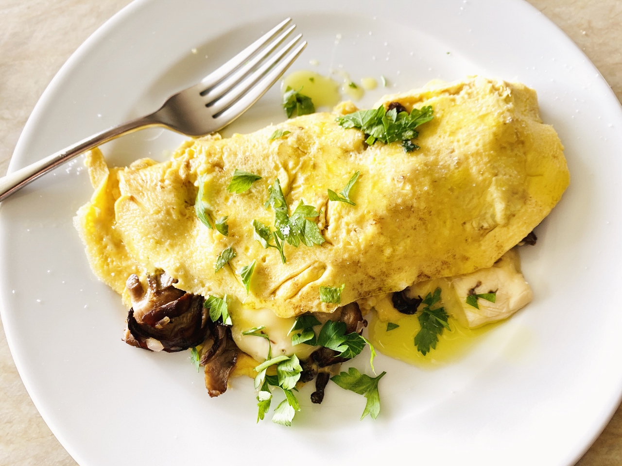 3. Add mushrooms and sliced cheese on top.  Using rubber spatula, fold half of egg circle on top of mushrooms and cheese, tipping pan slightly for assistance.  Slide omelette out of pan onto plate and drizzle with olive oil and top with parsley.  Serve immediately.  Enjoy!