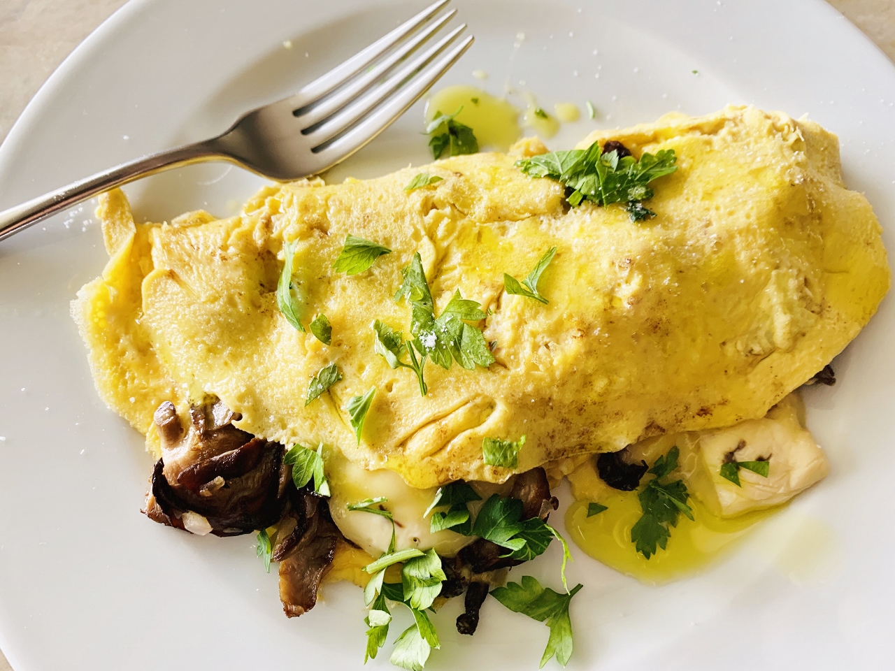 3. Add mushrooms and sliced cheese on top.  Using rubber spatula, fold half of egg circle on top of mushrooms and cheese, tipping pan slightly for assistance.  Slide omelette out of pan onto plate and drizzle with olive oil and top with parsley.  Serve immediately.  Enjoy!