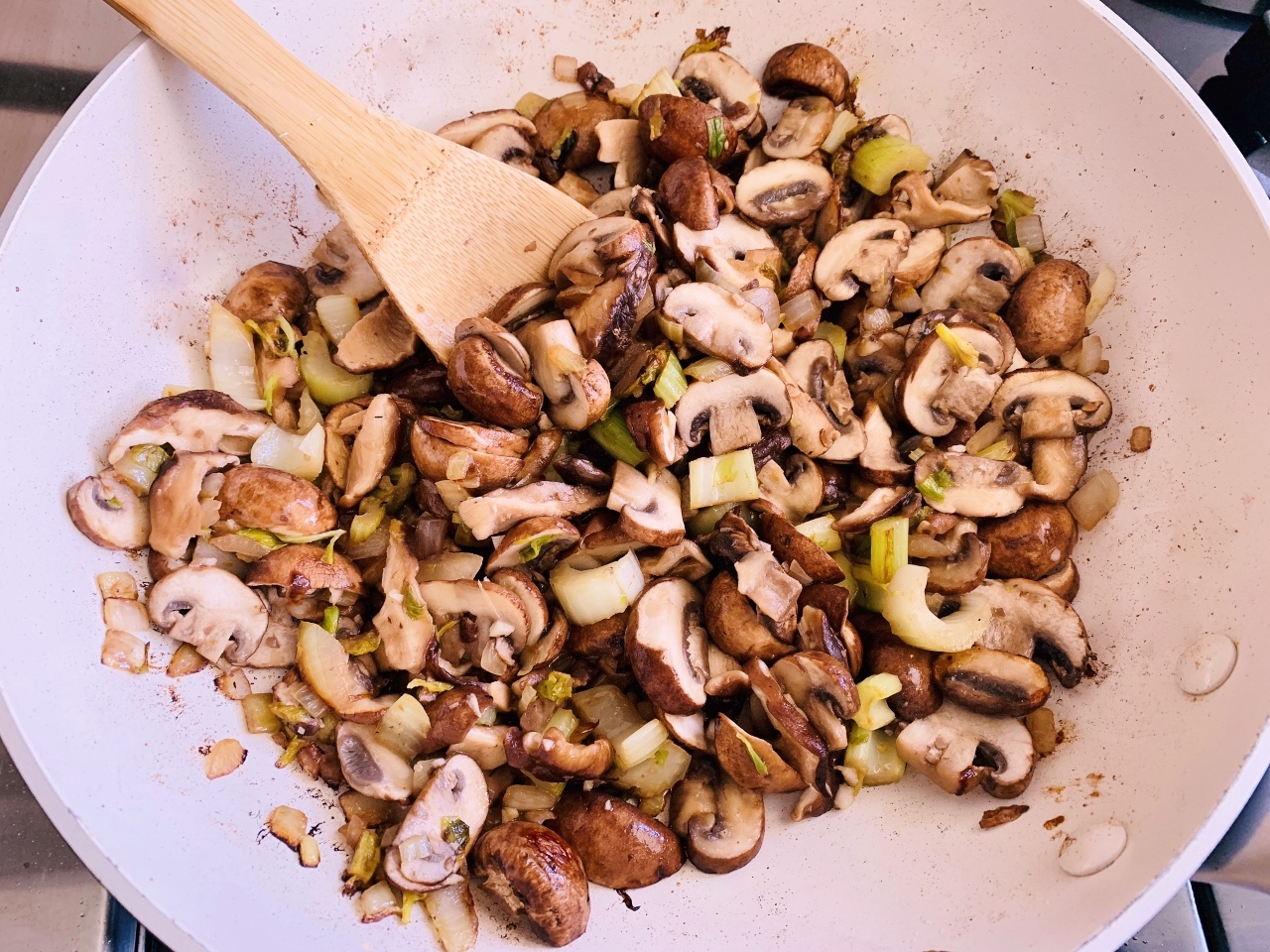 - Preheat oven to 375 degrees. In a large sauté pan, add 1 tablespoon butter and 1 tablespoon olive oil. Place pan over medium heat. Add mushrooms, onions and celery and sauté for 4 minutes.