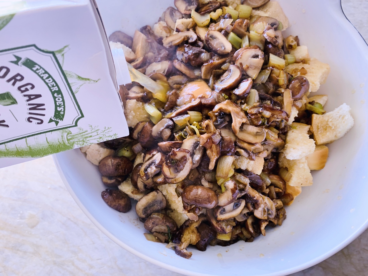 - Pour hot mushroom mixture over top of cubes. Add broth to bowl and stir to combine. Taste for salt and pepper, add more if needed. Mince sage leaves and add to dressing, stir.