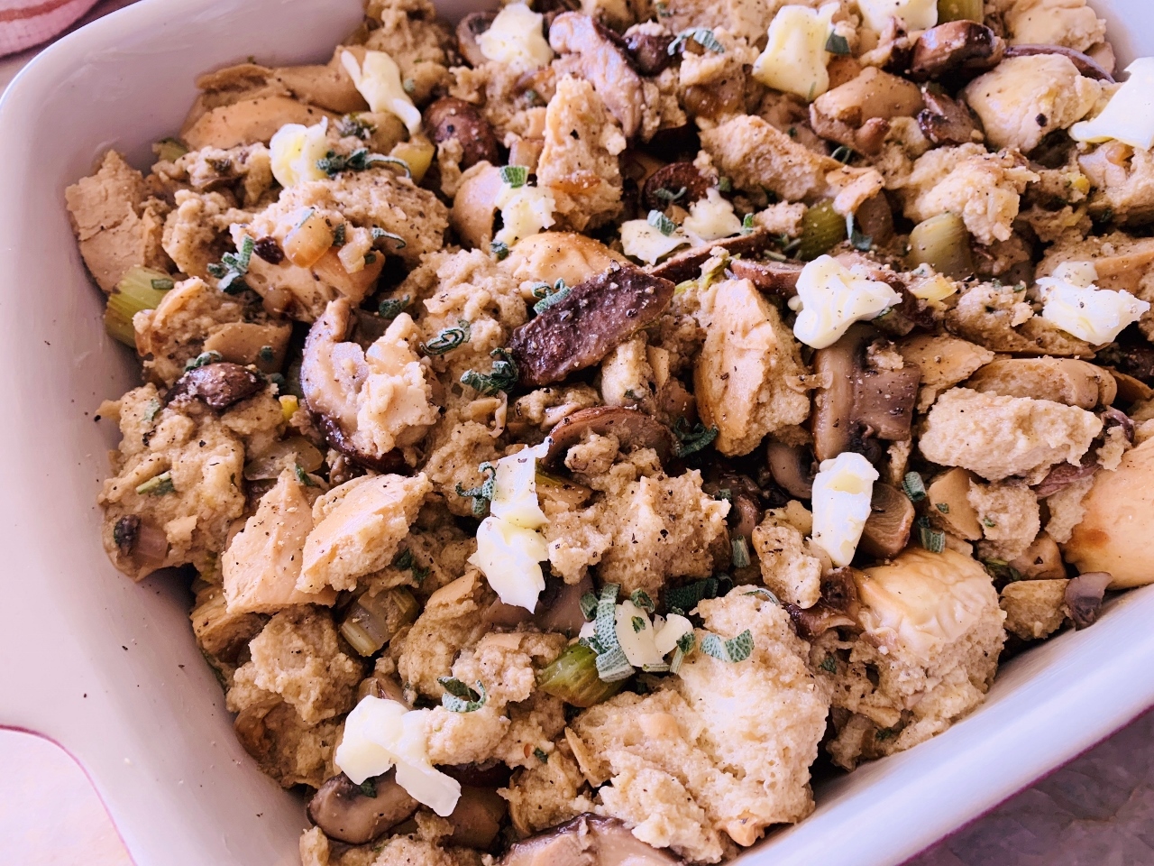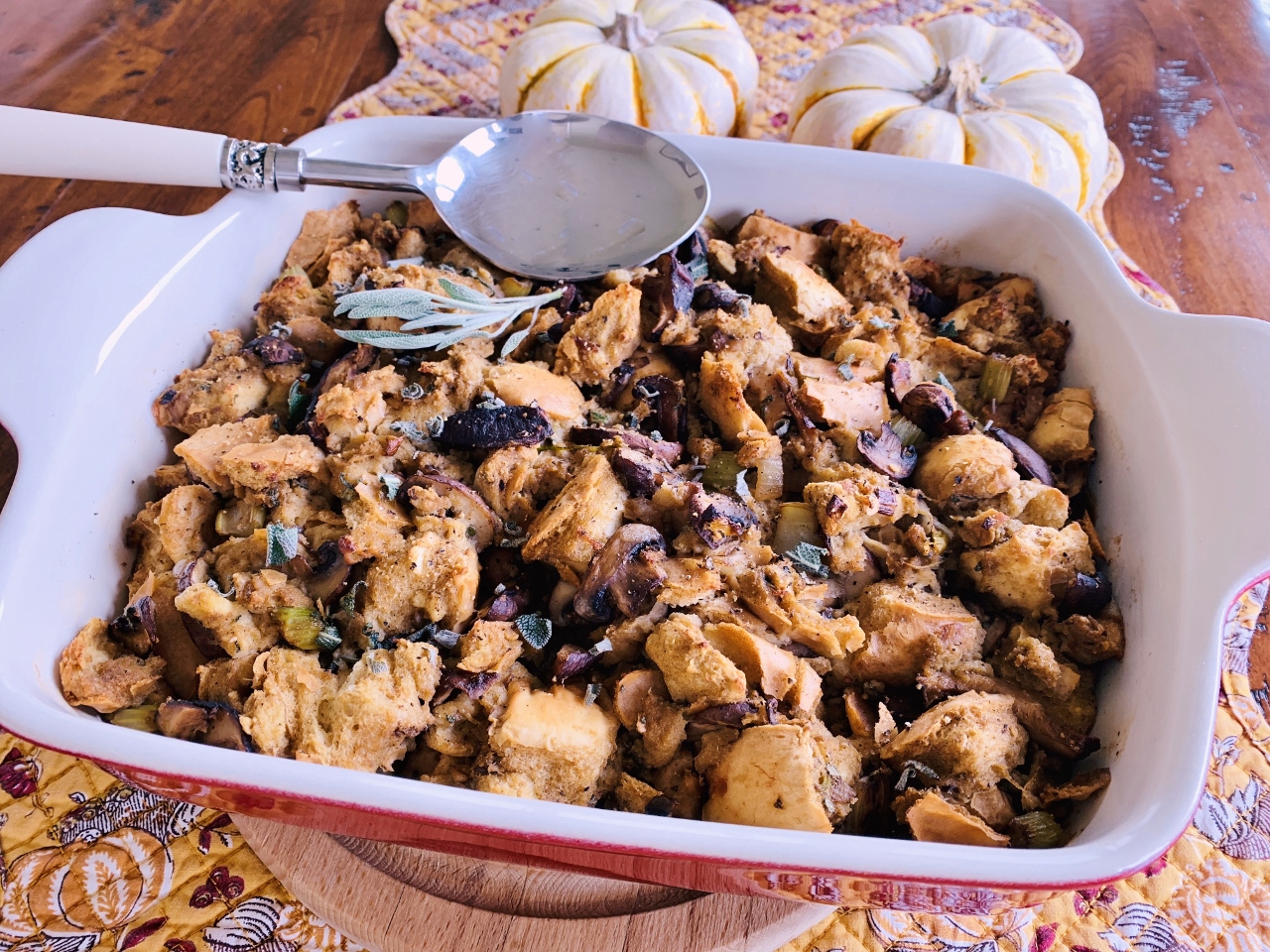 Mushrooms act like meat in this Thanksgiving side dish because they are hearty enough to hold their own in this dressing. The sautéed mushrooms, onions, celery and garlic lend their hand to the most robust flavors and become the star of the show. After baking, the bread cubes on top become crisp, while the meatless center stays creamy and delicate. Fresh herbs, like sage, really are fragrant and make the dish pop with freshness.