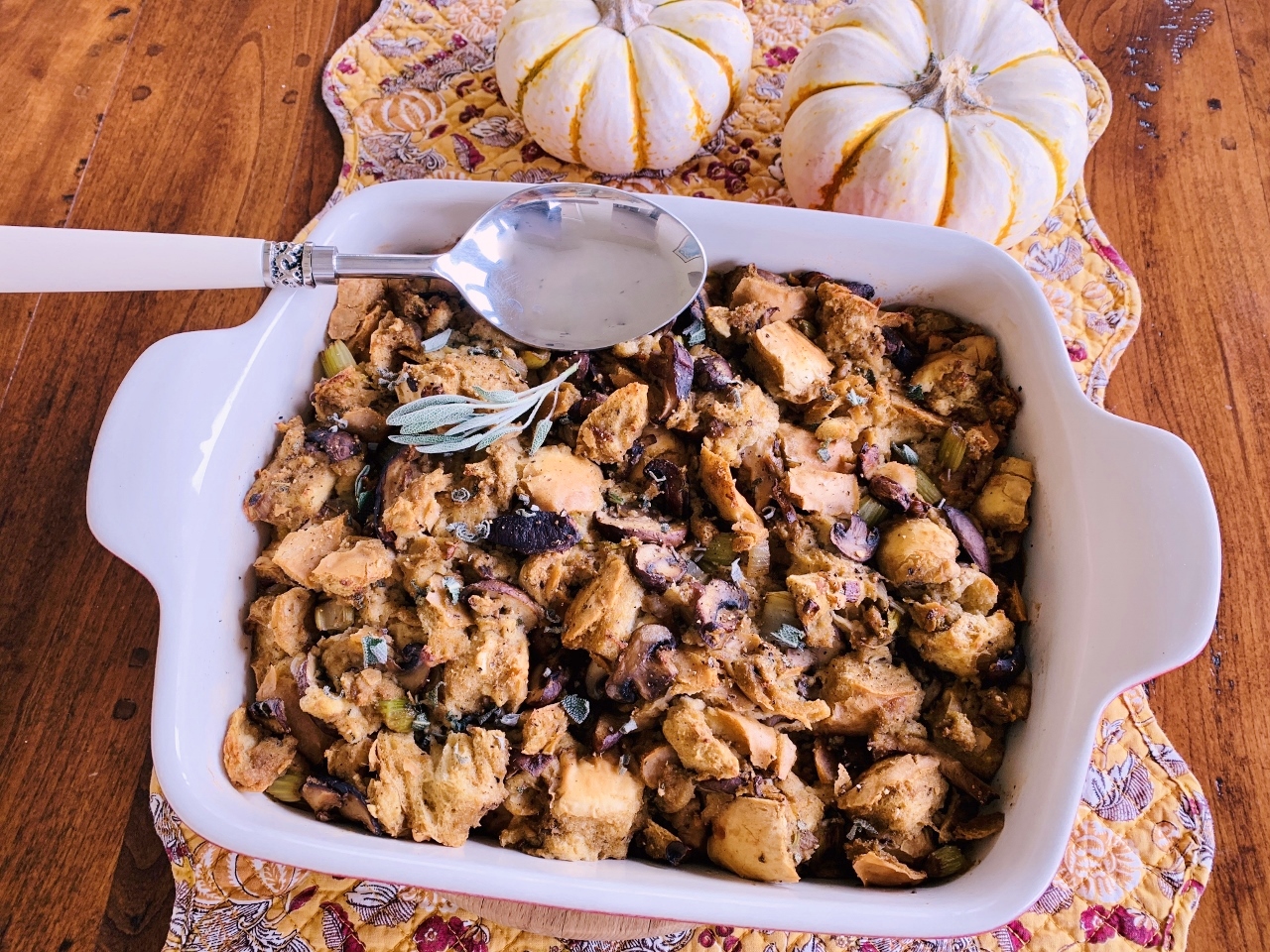 Mushrooms act like meat in this Thanksgiving side dish because they are hearty enough to hold their own in this dressing. The sautéed mushrooms, onions, celery and garlic lend their hand to the most robust flavors and become the star of the show. After baking, the bread cubes on top become crisp, while the meatless center stays creamy and delicate. Fresh herbs, like sage, really are fragrant and make the dish pop with freshness.