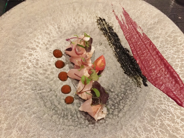 Modern Zukuri or Kampachi sashimi-style with Pepper Jelly and a smear of Nori Sauce and Beet Puree.  The Nori added a salty component to the fresh fish and the Beet counterbalanced with a hint of sweetness.  Isn’t this beautiful.