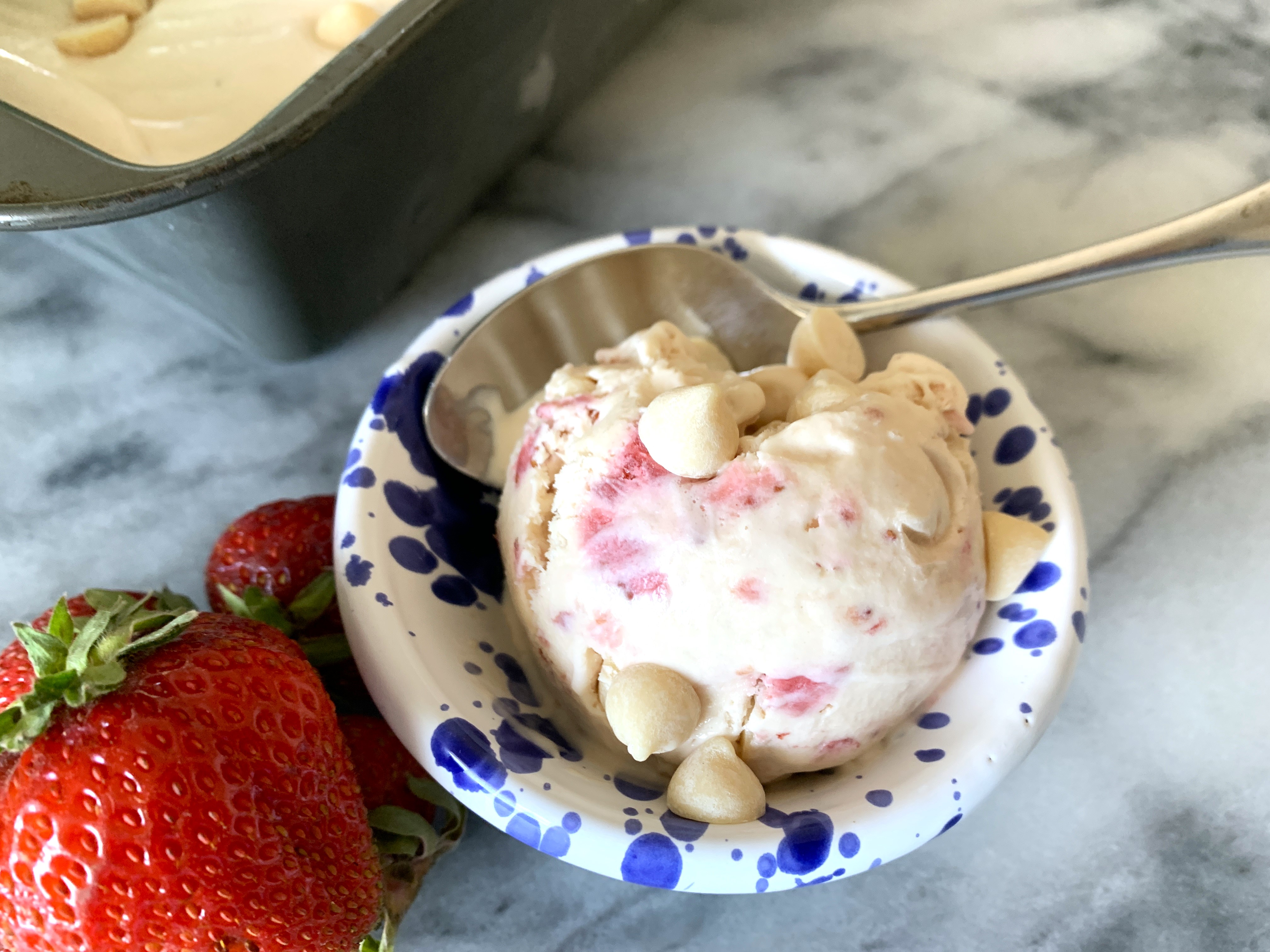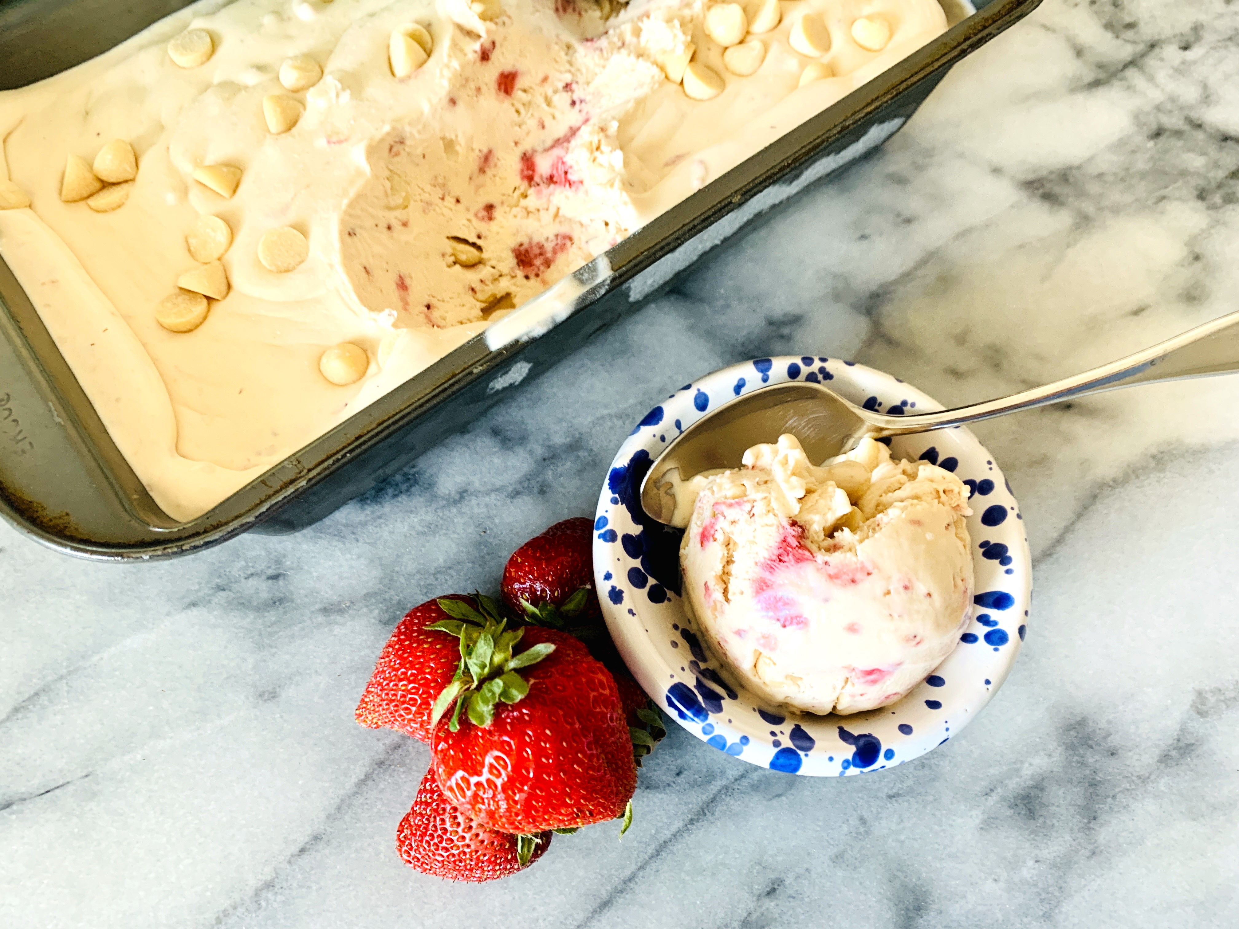This creamy ice cream is made with whipped heavy cream and sweetened condensed milk — the fresh strawberries are added as a syrup made on the stove top beforehand. This chunky strawberry syrup is cooled and folded into the creamy mixture right before freezing in a loaf pan, and the results are spectacular.