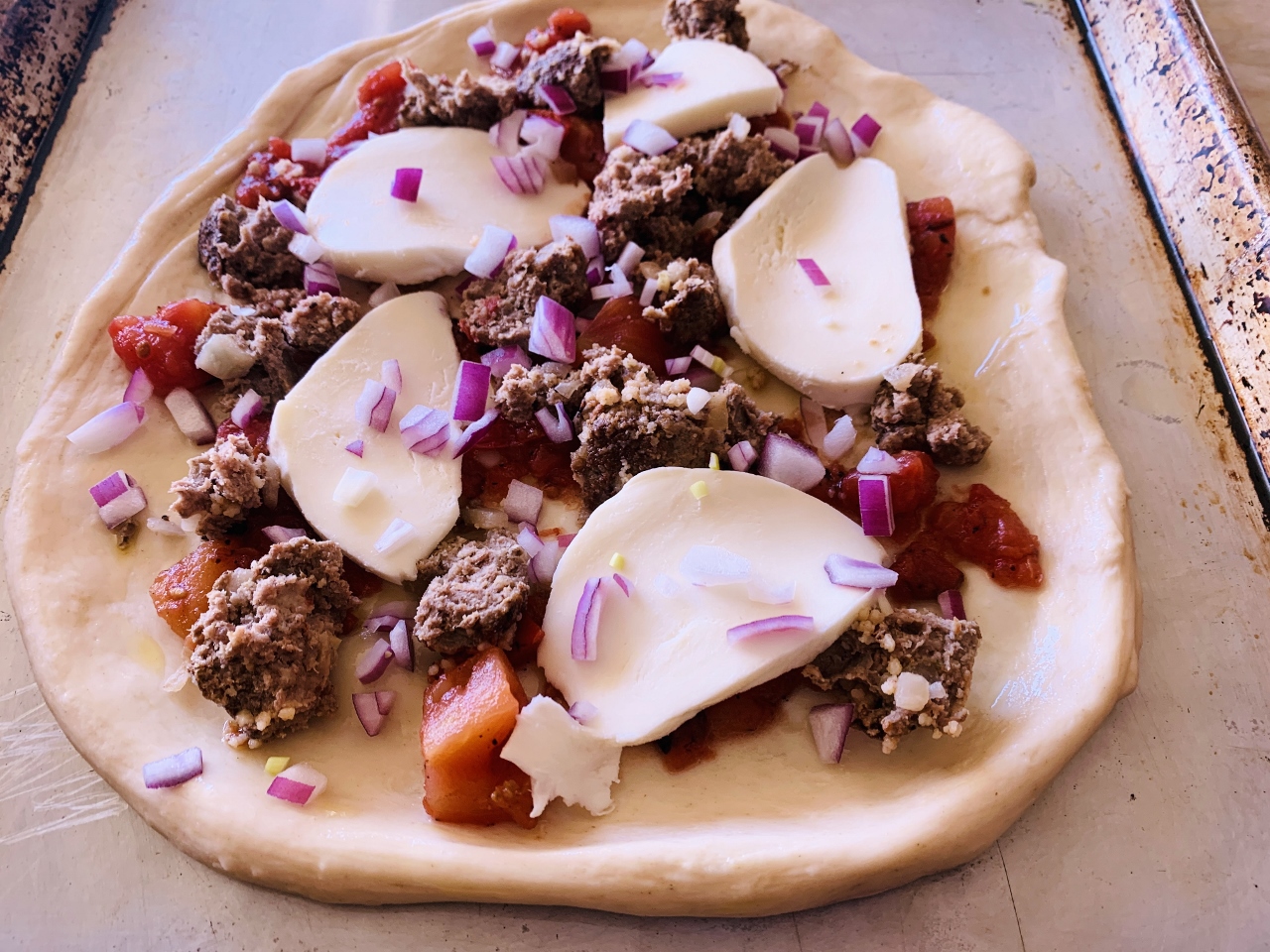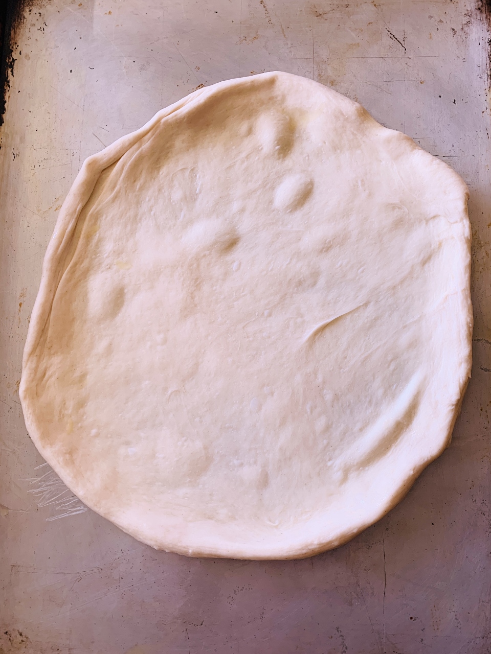 - Preheat oven to 450 degrees. Stretch dough into large round or rectangle and place on greased sheet pan. Brush with oil and top with favorite toppings.