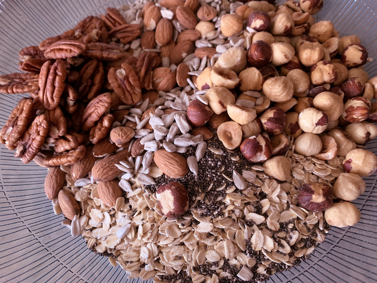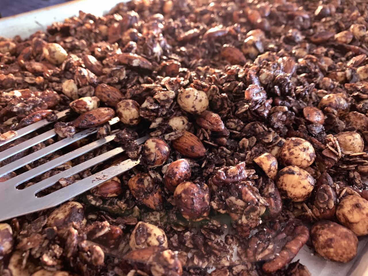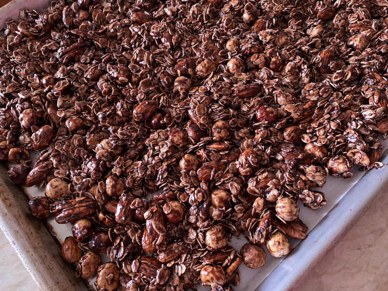 - Preheat oven to 225 degrees. In a large bowl add granola, nuts, sunflower seeds and chia seeds, toss. Add cocoa powder and salt, toss again.