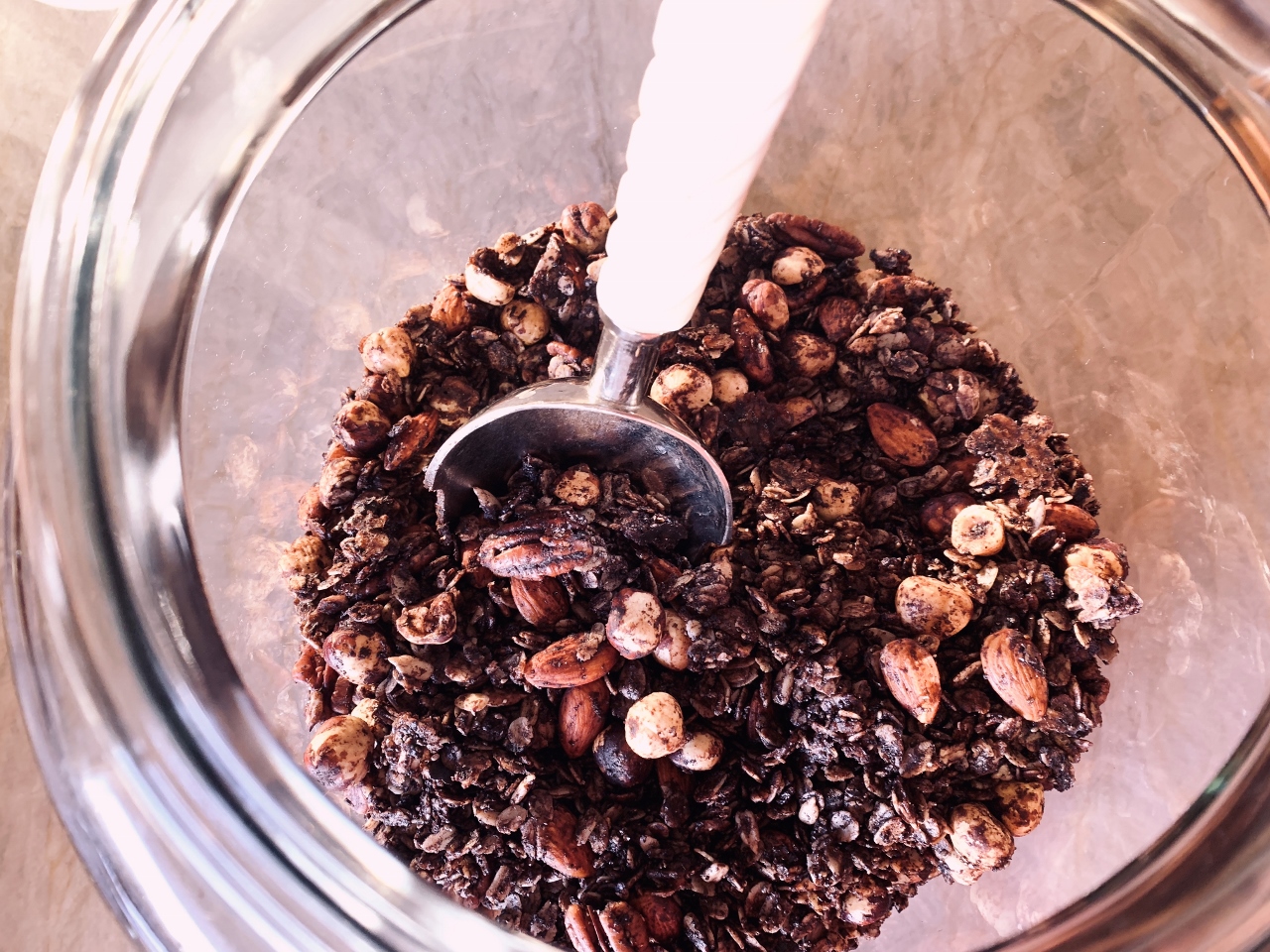 - Preheat oven to 225 degrees. In a large bowl add granola, nuts, sunflower seeds and chia seeds, toss. Add cocoa powder and salt, toss again.