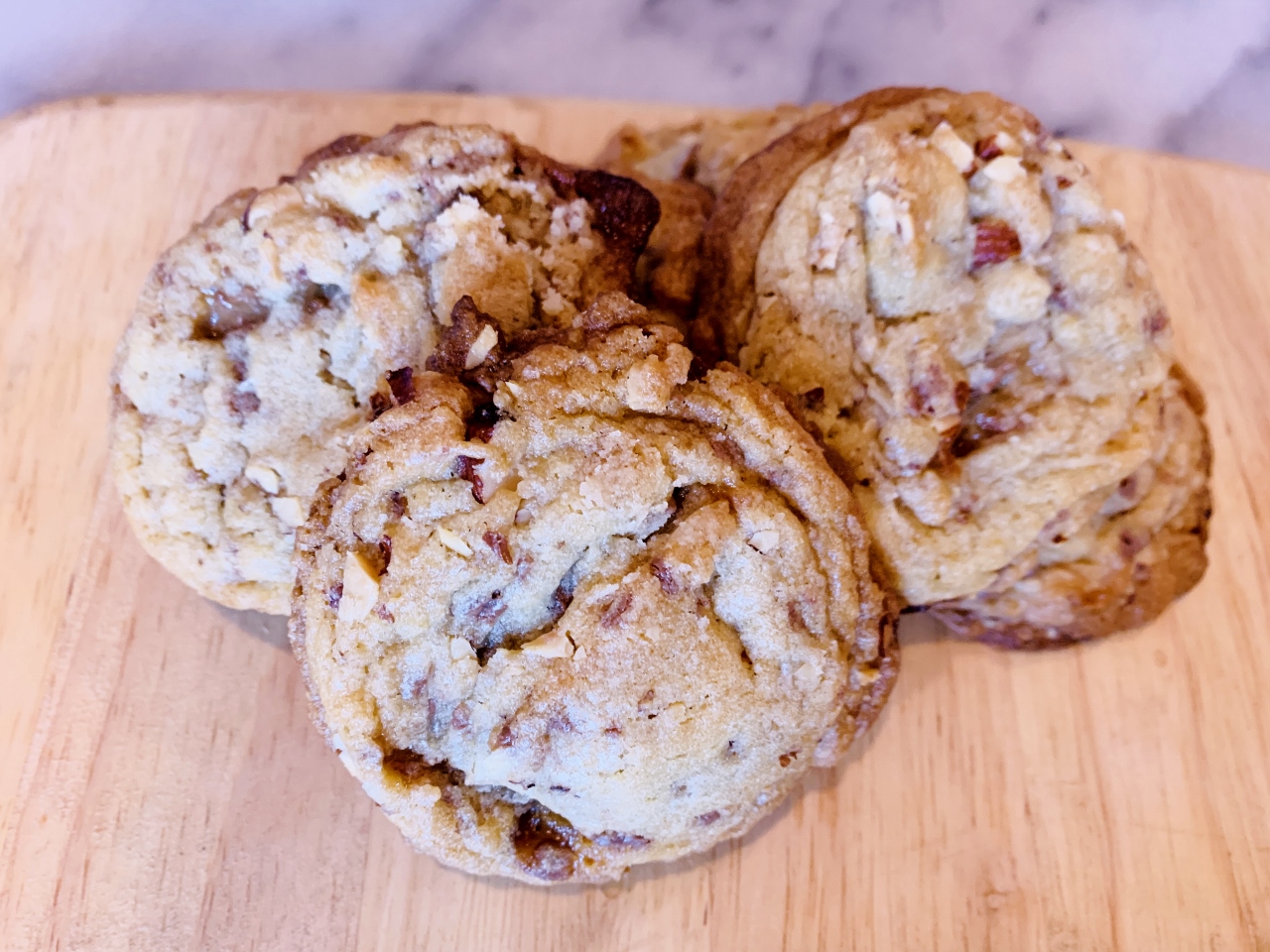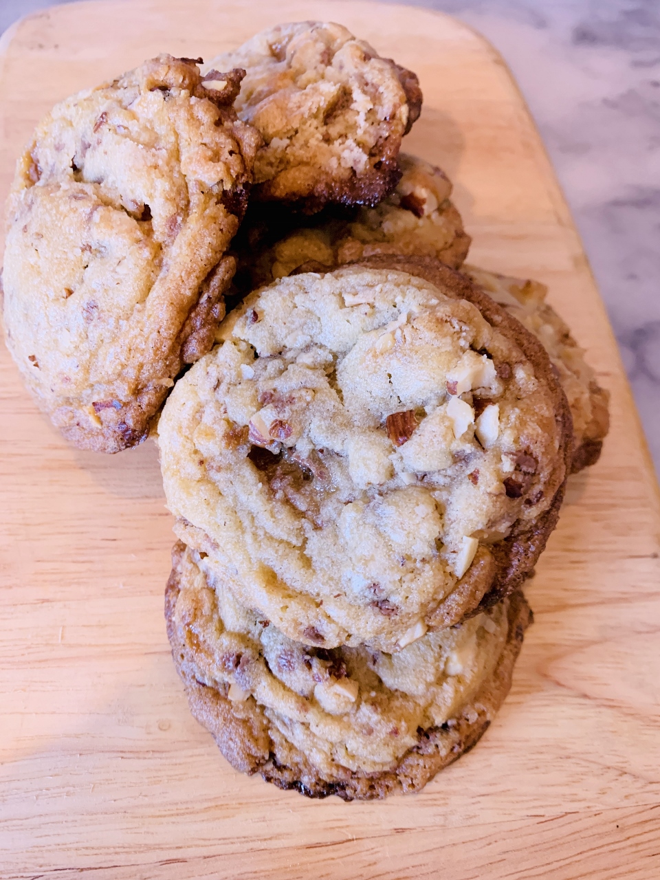 Twix bars are those cookie crusted, caramel and chocolate coated candy bars that we all have grown so fond of over the years. The miniature version make a pretty perfect snack, but have you ever tried them in a cookie? Hmm, well let me tell you, they’re awesome. The little bits of cookie add crunch to a soft dough, while the caramel gives them chew after baking. The chocolate, well you know, adds chocolate to every bite, and creates one amazing treat. I also added chopped almonds, smoky almonds to be exact, because I wanted to build on flavor. You could always use regular toasted almonds, but the smoked ones are pretty cool. Everyone should bake a batch and enjoy these around this time of the year.