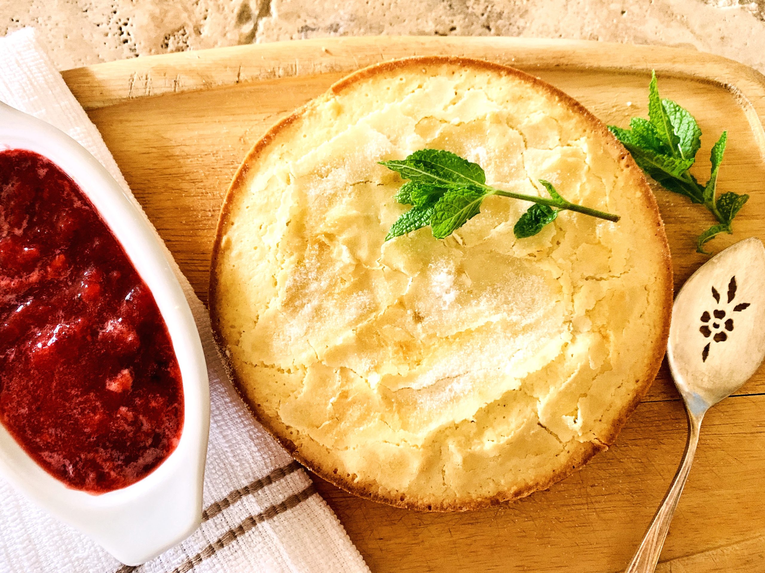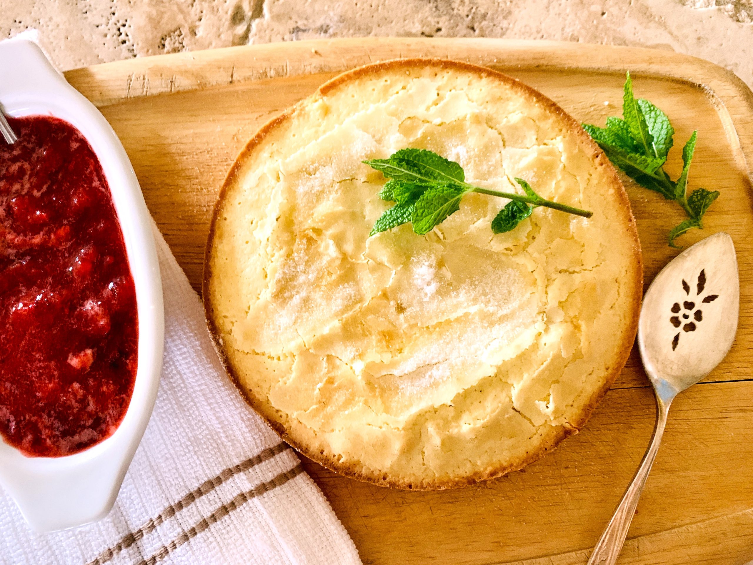 - Place cake on serving board with chunky strawberry sauce to serve. Enjoy!