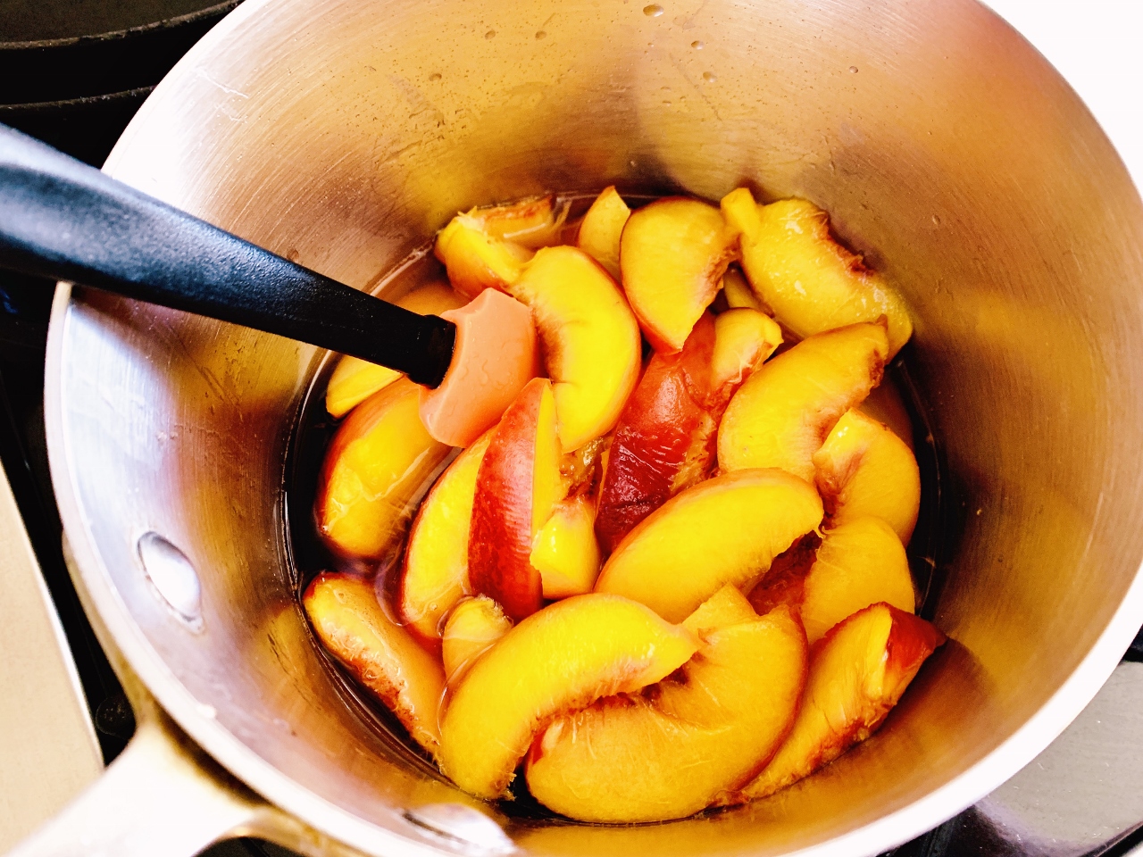 5. Slice peaches and set aside.  In a saucepan, add sugar, water and Amaretto.  When simmering, add peaches and let cook for 3 minutes.  Turn off heat and let rest in syrup, until ready to serve.  Slice cake and serve with spoonful of peach compote.  Enjoy!