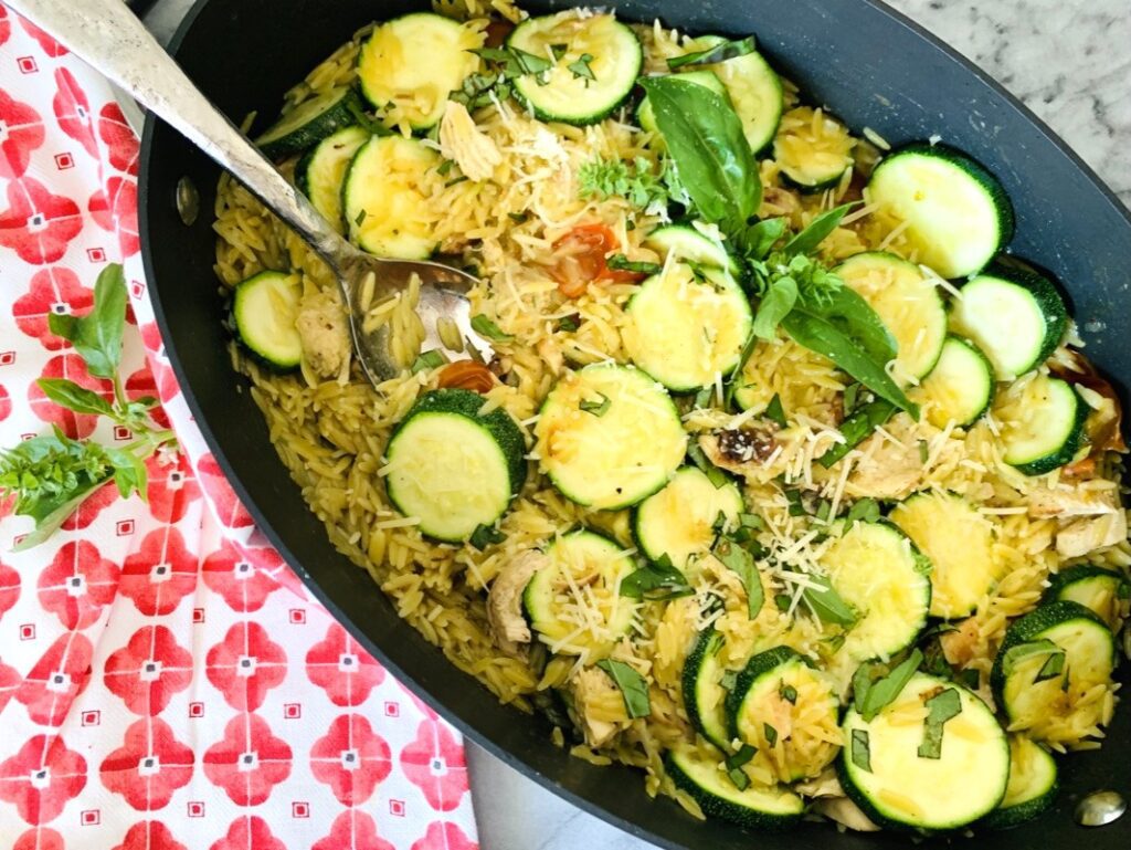 Using a large pan on the stove top cuts down on clean up and makes mealtime quick and easy.  Using either store-bought rotisserie chicken or leftover chicken like from my Crispy Chicken and Citrus Salad, cuts down on cooking time, so you can enjoy the evening.  The chicken and zucchini go so well together, and when you add some creamy orzo to the mix, it creates a heavenly dish that’s pleasing to everyone.