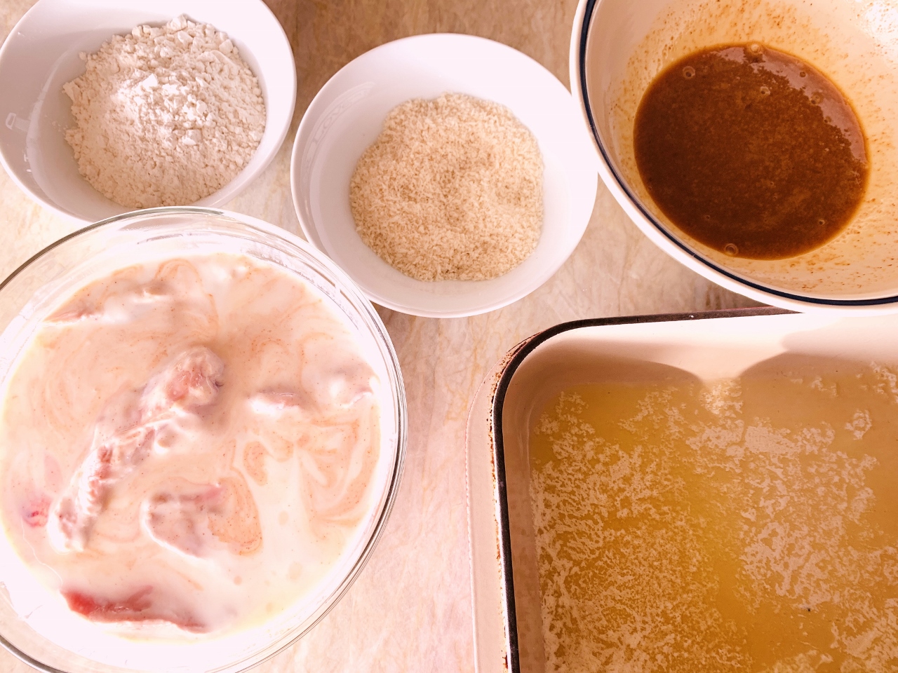 1. Add buttermilk and hot sauce to a large bowl, stir.  Place chicken to soak for at least 4 hours, up to overnight.