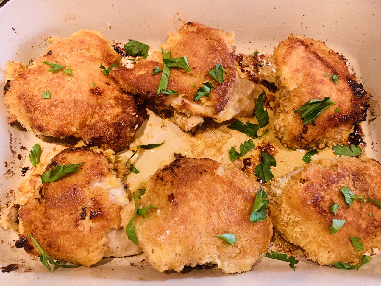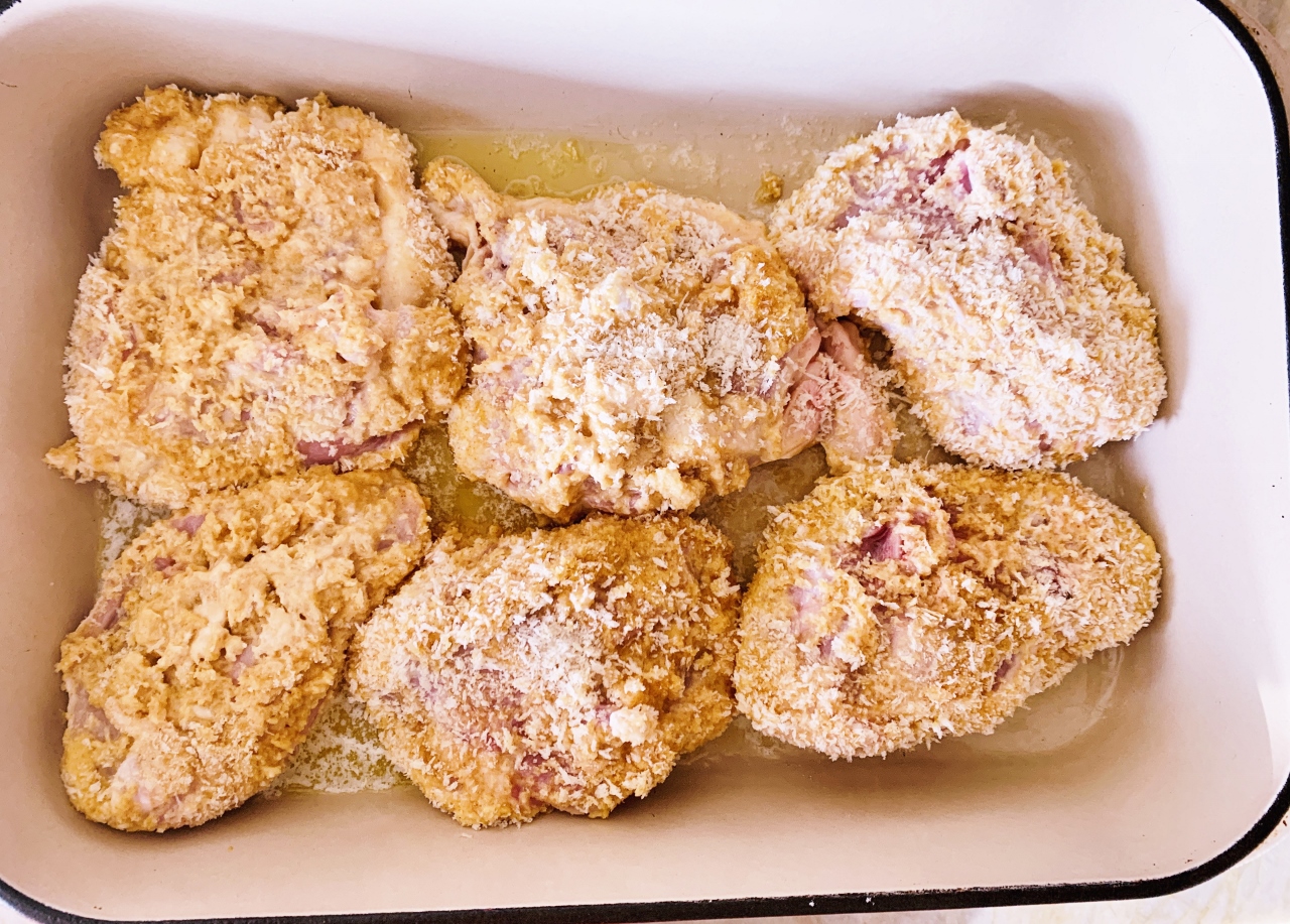 4. To coat chicken – dip into flour mixture, then egg mixture, then panko.  Place skin side down into melted butter in dish.  Repeat until all chicken is coated.